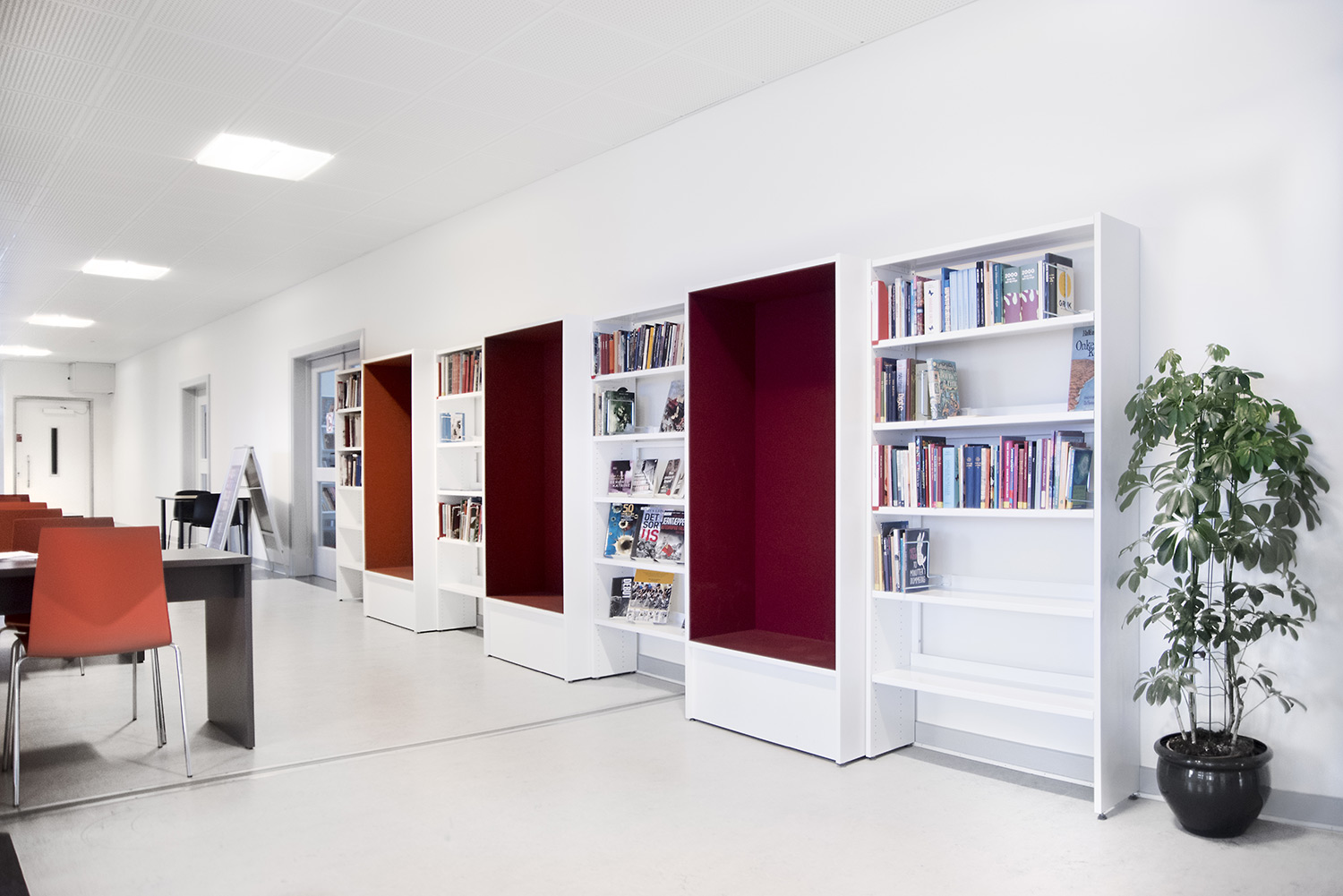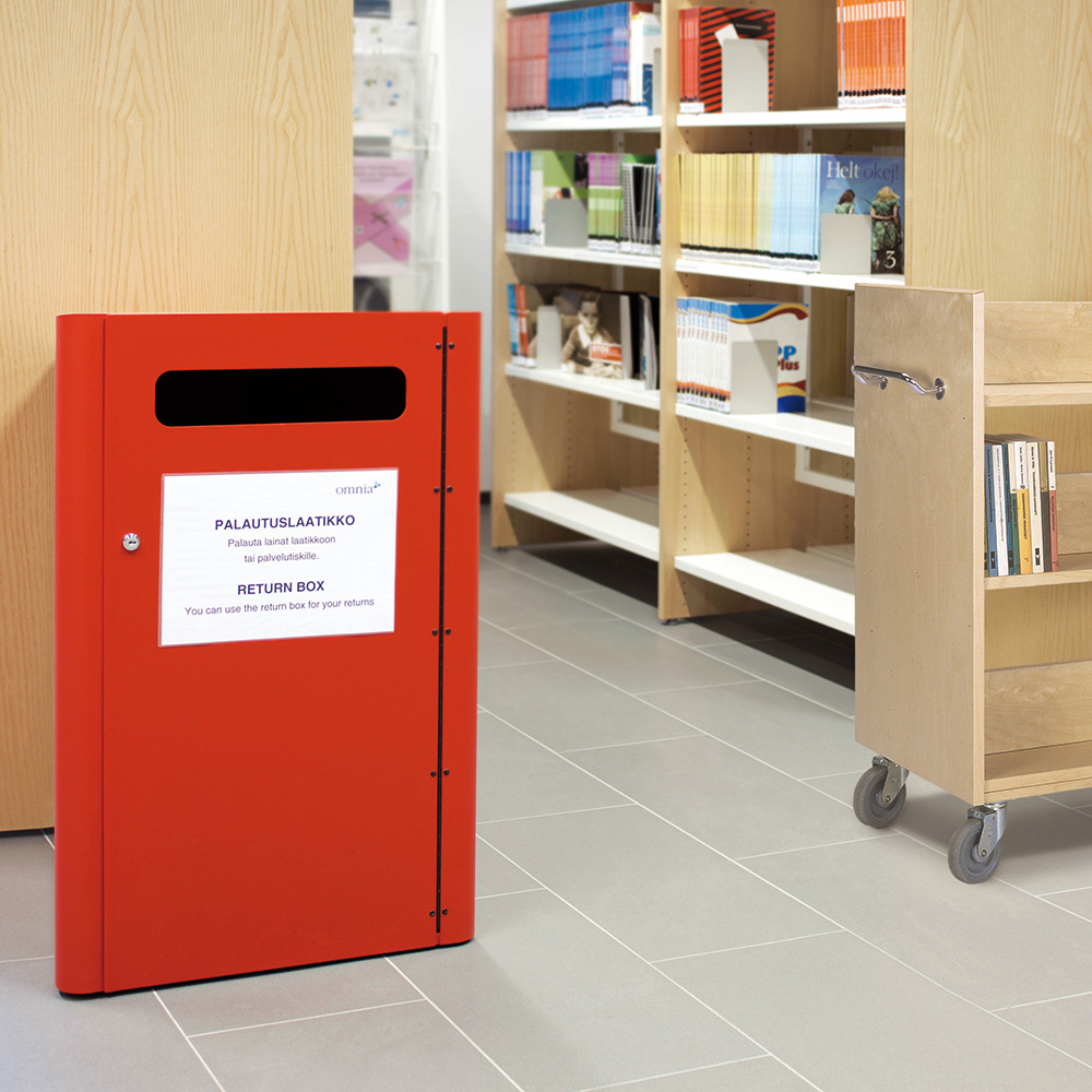 Återlämningsfack i metall utrustat med fäste undertill (stöldsäkring). Levereras med korg på hjul (kan även beställas separat) och självhäftande piktogram (böcker och CD/DVD).