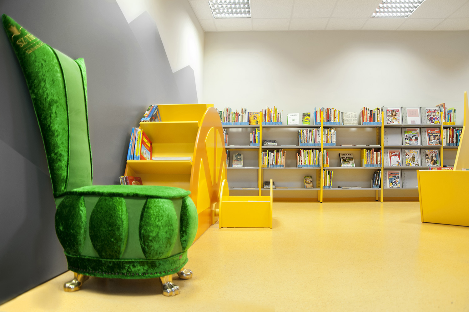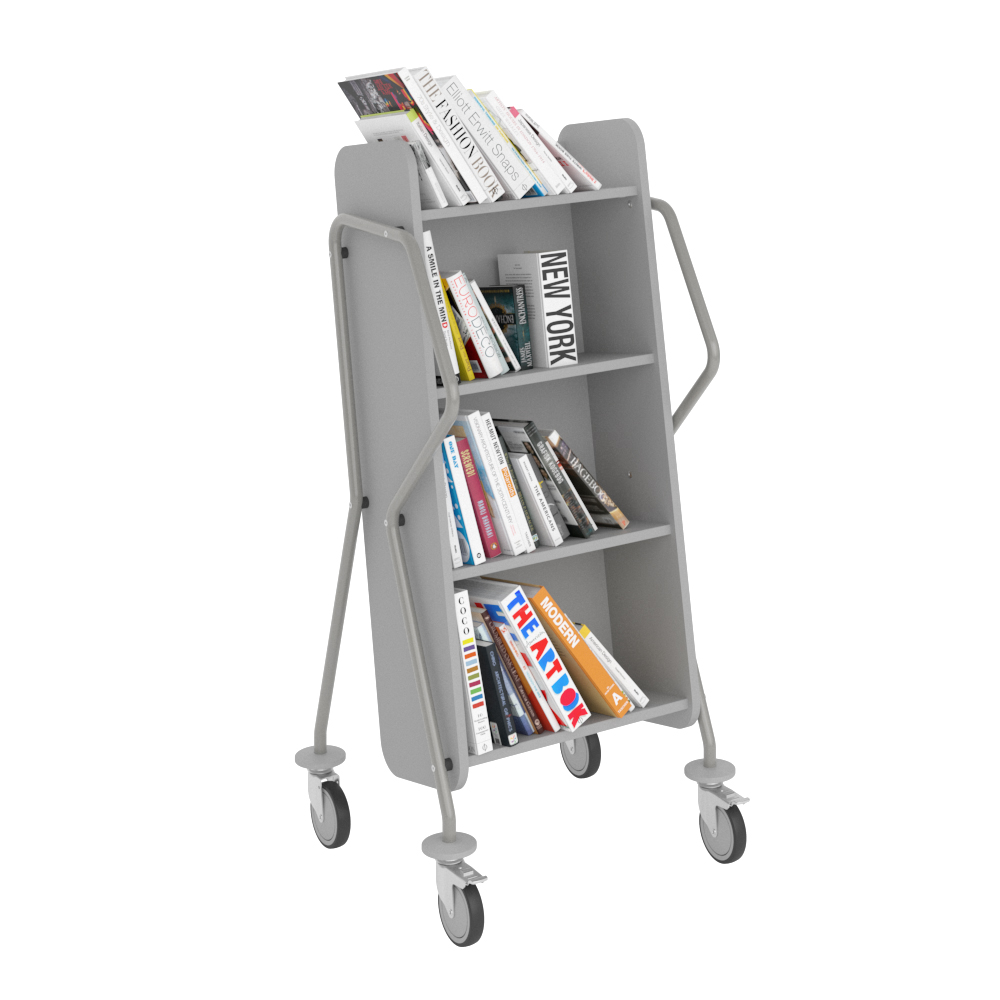 Ergonomisk, användarvänlig, enkelsidig bokvagn med 4 hyllplan med generösa hyllavstånd. Idealisk även för böcker i det lite större formatet.
