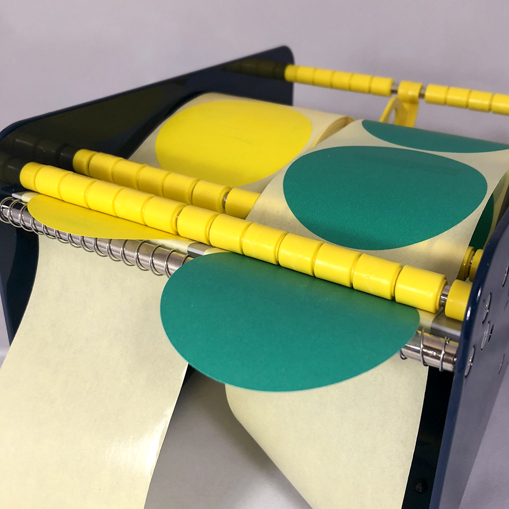 Universaldispenser lämplig för 2 rullar med runda, avtagbara etiketter.