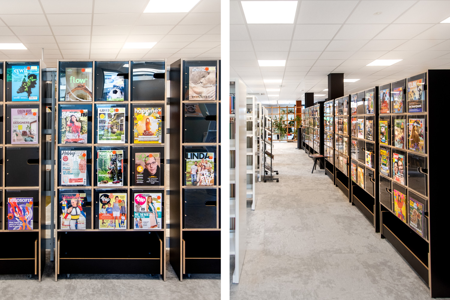 Försedd med räfflad gummimatta, som hjälper till att hålla tidskrifterna uppe så de inte glider ned, och med plats för stående A4-format.
