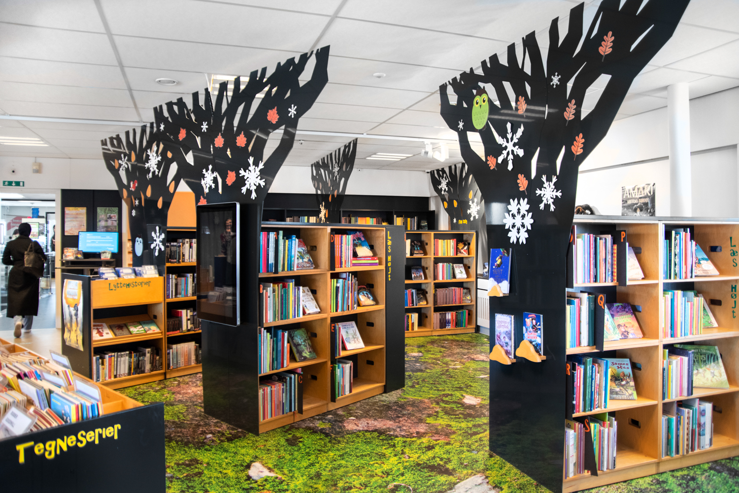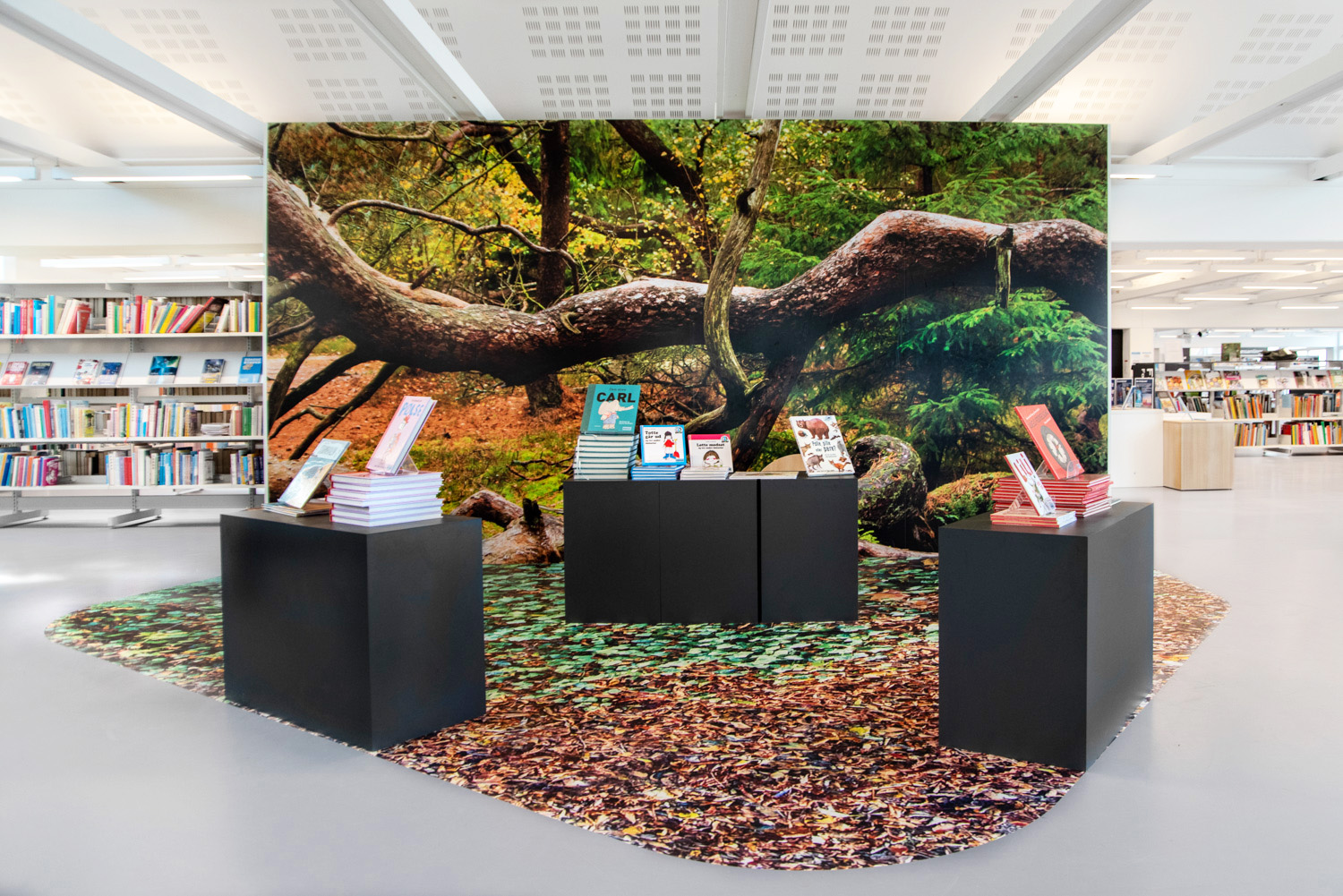 Genom att ta in skogen och stranden i biblioteket kan besökarna njuta av en ostörd promenad bland träden eller ta en båttur på vattnet. Specialdesignade träd är gjorda som gavlar för hyllorna med böcker på hängande displayer som matchar de matchande trågen och grafik på golvet med illustrationer av skogsmark, stenar, hav och sand.