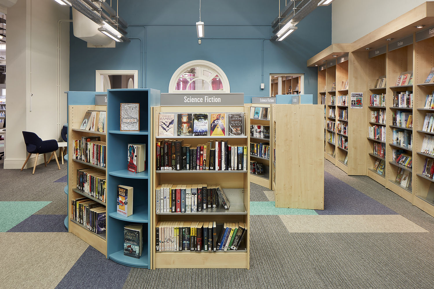 Förutom ny, fin design visar det nya vuxenområdet prov på vårt engagemang för hållbar konsumtion, där alla hyllor från det gamla biblioteket återanvänts eller uppgraderats i det nya området för att eliminera behovet av nya.
