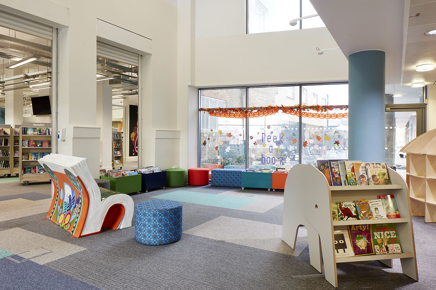 I och med att det nya barnområdet nu ligger mycket centralt i det som tidigare var ett atrium i öppen planlösning, fick man en ytterligare utmaning i att tydligt avgränsa det nya området samt skilja det från övriga biblioteksfunktioner. Därför installerades akustikpaneler med specialdesignat, livfullt mönster omkring området, vilket skapade den nödvändiga avgränsningen samtidigt som de bidrog till områdets visuella särprägel.