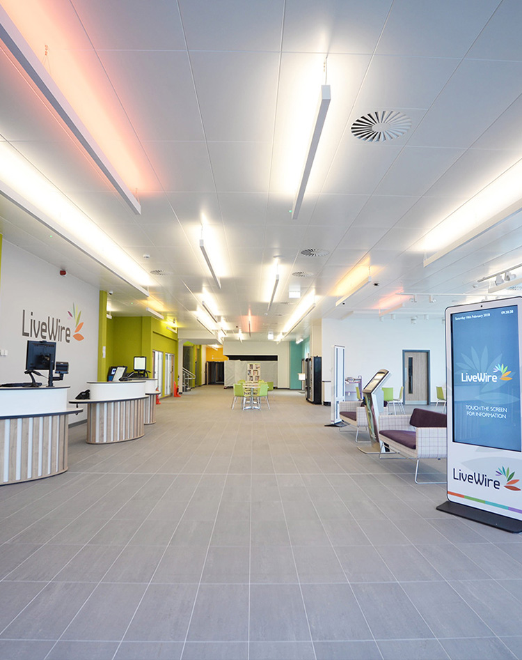 Great Sankey Neighbourhood Hub erbjuder flera faciliteter. I byggnaden ingår flera hälso-, fritids- och bibliotekstjänster för lokalsamhället. Thedesignconcept ltd. har arbetat nära alla inblandade för att skapa en design enligt arkitektens ursprungliga vision. Eftersom byggnaden är det första offentliga hälsocentrat som söker demensvänlig certifiering, undersökte vi 'best practice' för demensvänlig design i syfte att uppnå godkännande från Stirling DSDC.