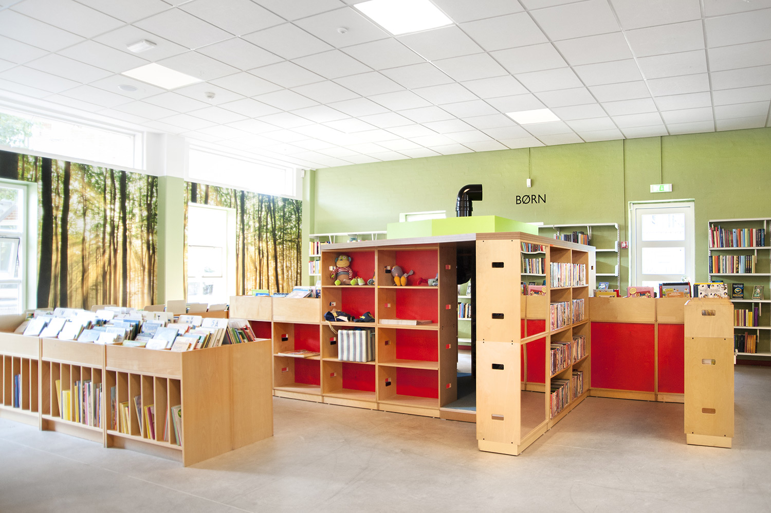 På Taulov bibliotek har man genomfört en enkel uppgradering av de befintliga röda hyllorna med nya gavlar. På barnavdelningen har man tillfogat sidopaneler till bilderbokslådorna, vilket tillsammans med de specialbyggda husen skapar en fin stämning.