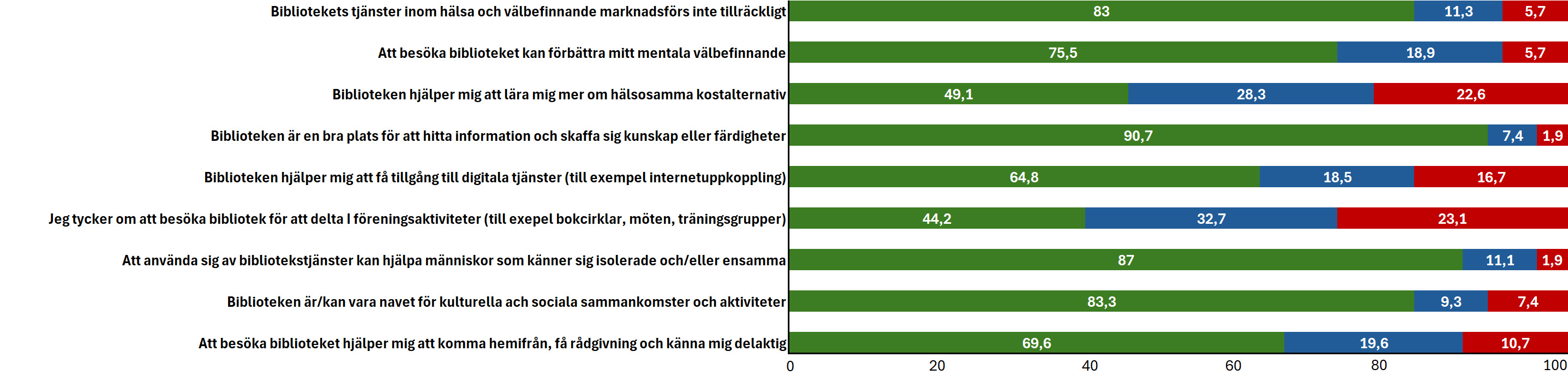 (Grön = instämmer; Blå = varken instämmer eller instämmer inte; Röd = instämmer inte).