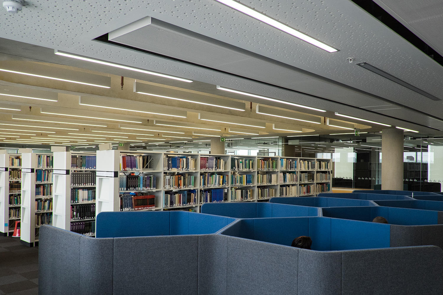 Thedesignconcept Ltd. har kommit på många lösningar för nya möbler och inredning till universitetets bibliotek. På alla nio våningar finns studiebås för individuell läsning och större ytor för grupparbete. Eleverna kan slå sig ner i färgglada mjuka sittmöbler och göra läsningen så behaglig som möjligt.
