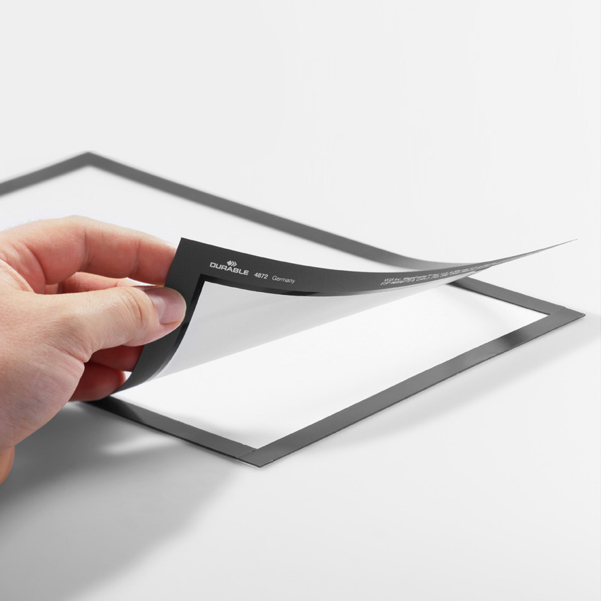 Magnetramarna (Duraframe® Magnetic Plus) fäster på magnetiska underlag såsom hyllgavlar av metall, whiteboardtavlor etc.
