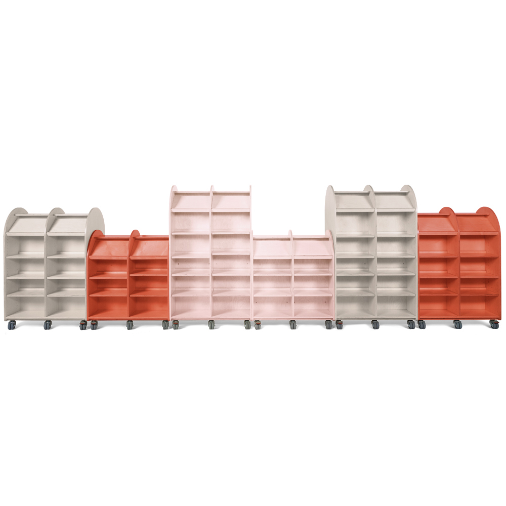 Du kan enkelt förändra ett plant hyllplan till ettvinklat tidskriftshyllplan genom att sätta fästena diagonalt i panelen. Hyllsystemet är detsamma. Enkla och flytta rundt på med dubbla hjul av hög kvalitet. Användarvänligt är nyckelordet.