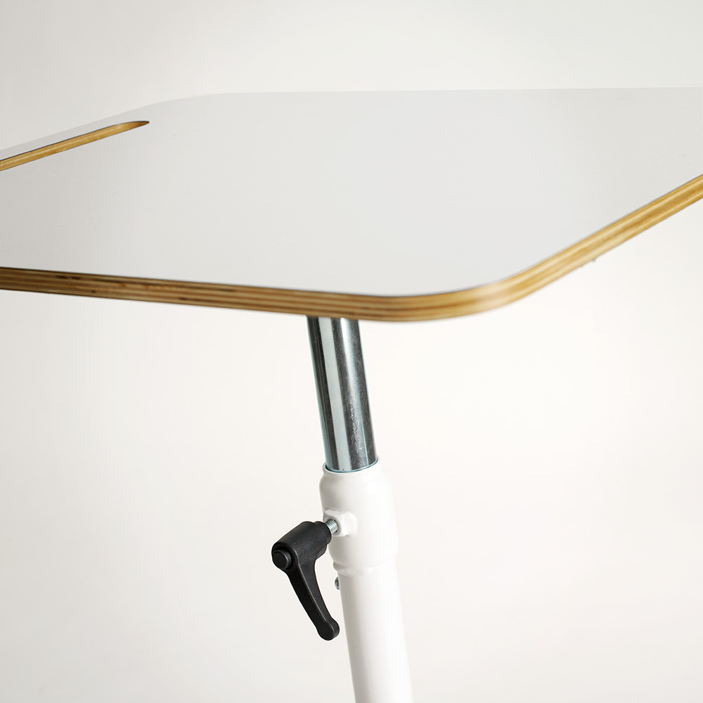 Hjul och lutande arbetsskiva försedd med ett greppvänligt uttag gör bordet lätt att flytta. Gummimattan ger ett bekvämt fotstöd.