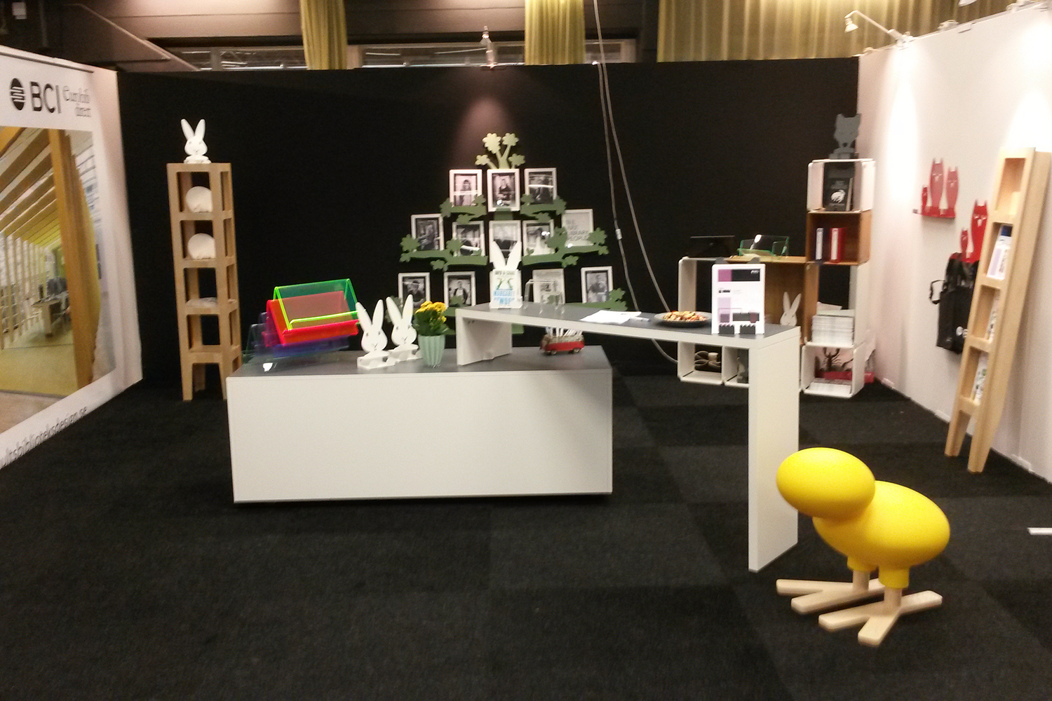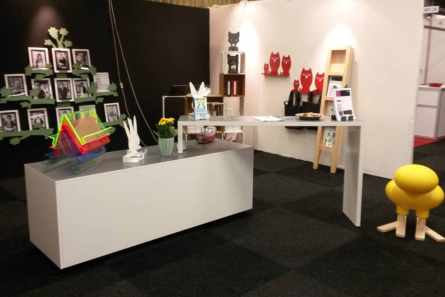ShowIt exponeringsdisk i vitlackerat utförande med Virrvarr laminat på toppen tjänade som utmärkt mötesplats och exponeringsyta medan Happy Bird lockade många mässbesökare till både leende och provsittning.
