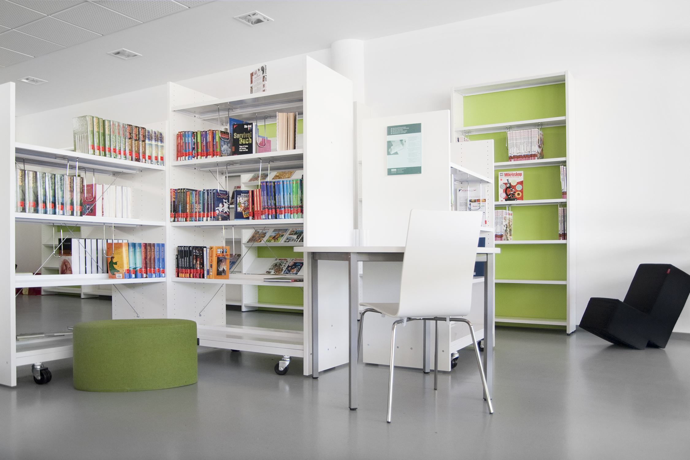 Den gröna och vita interiören ger en naturlig och frisk atmosfär och hänger samman med grönskan i den intilliggande atriumgården. Den är designad för att ge plats och inspiration till både självstudier och kommunikation mellan eleverna. Det är ett friskt och luftigt rum som göra lärandet roligt pch erbjuder ett avslappnat forum för skolans olika arrangemang.
