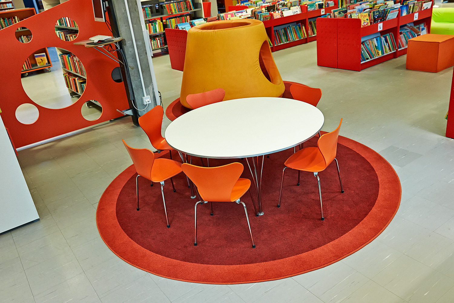 Området är indelat i två sektioner: en för de yngre barnen och en för tonåringar. De olika områdena har skapats med hjälp av färger, mattor och kulörta väggar som avdelare mellan hyllskepp.