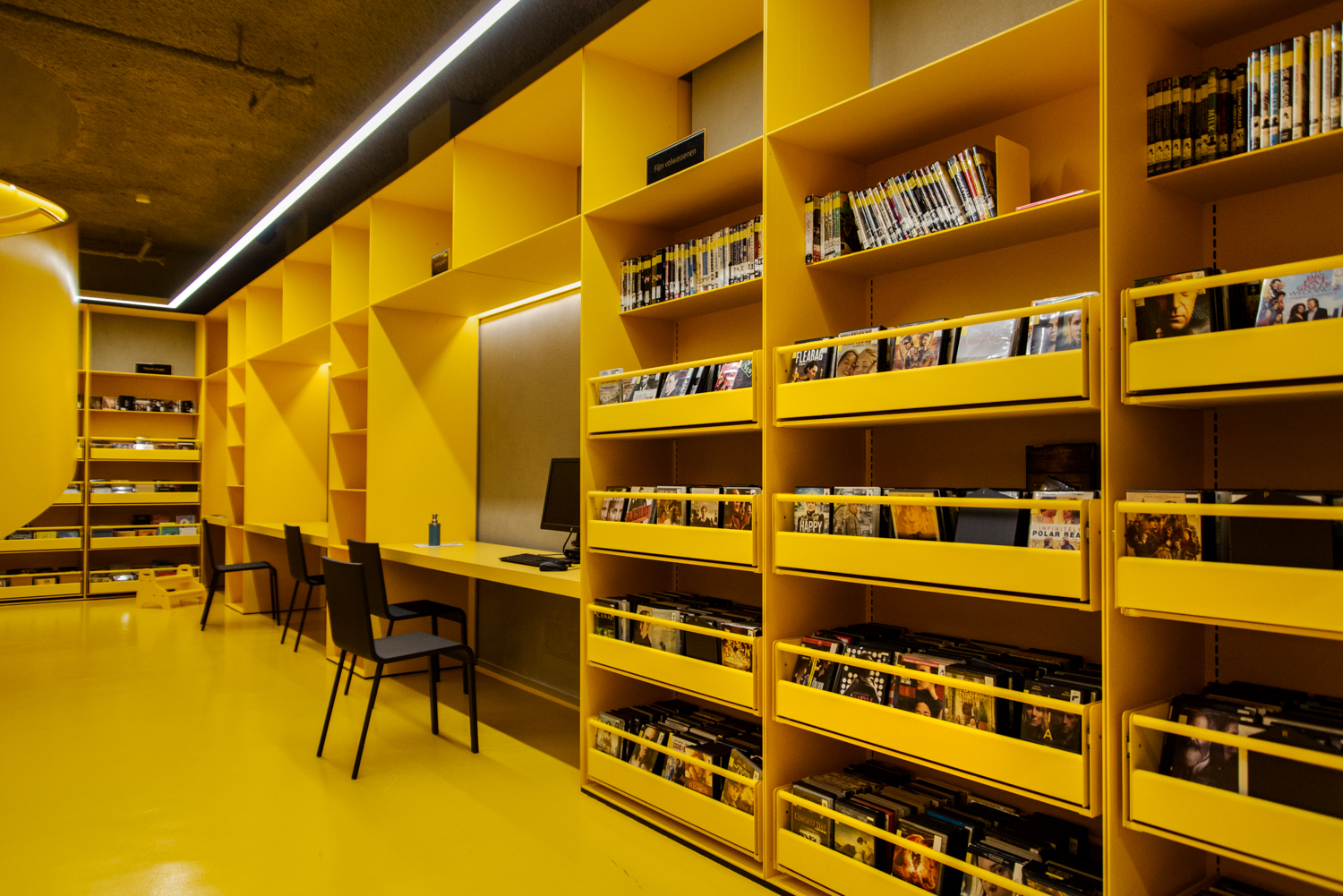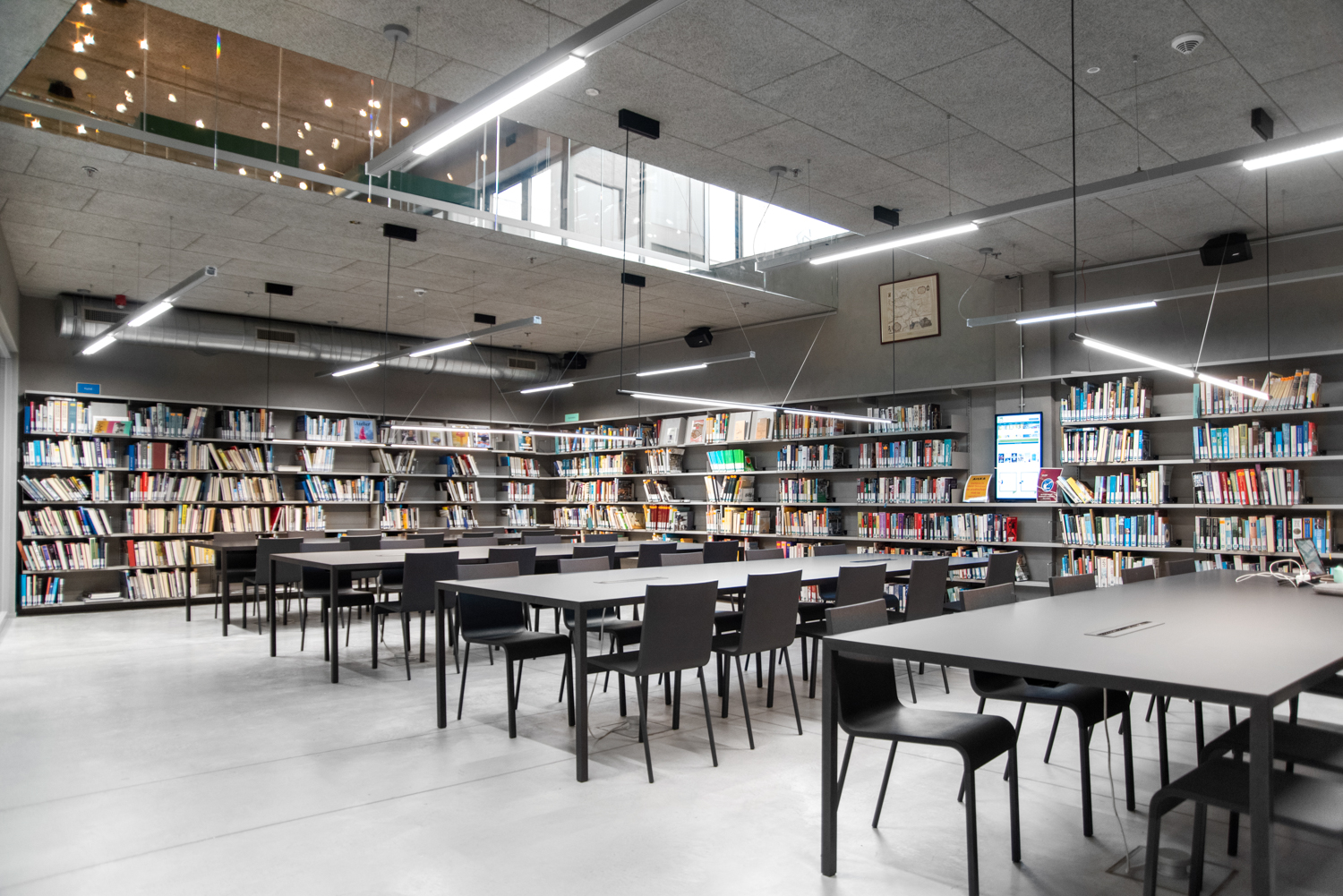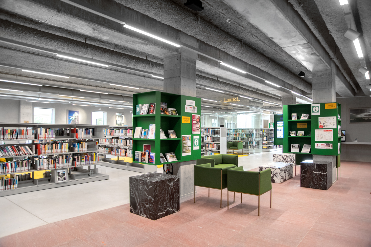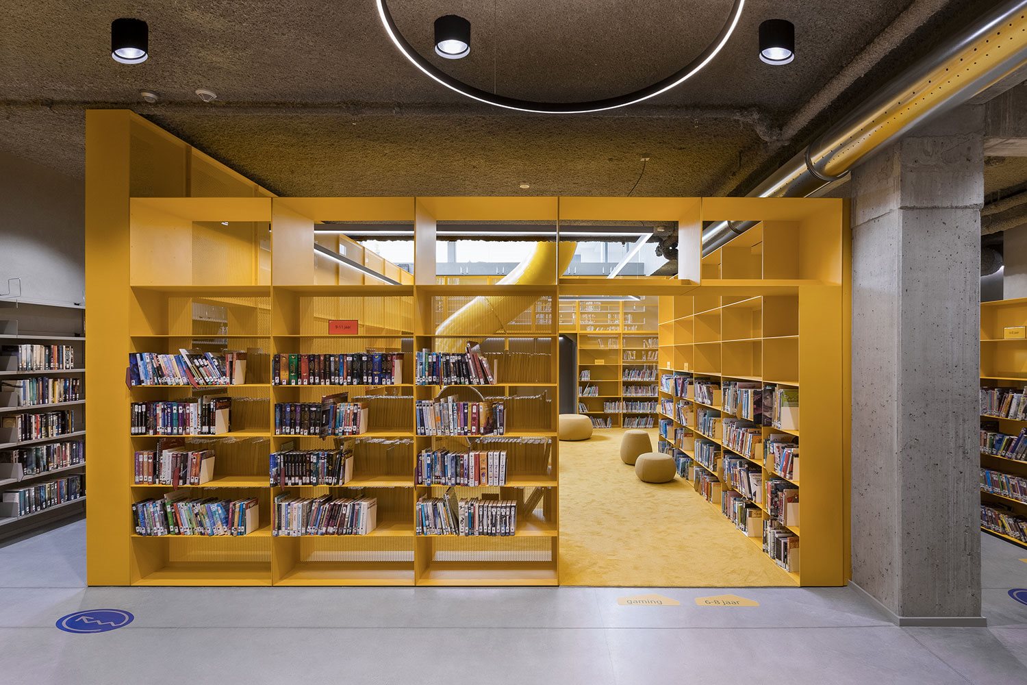 Detta avspeglar sig på många sätt: biblioteket är öppet 12 timmar om dagen, ungdomsbiblioteket är tillgängligt via en rutschkana från ingångsområdet, hyllorna hålls medvetet låga och uppblandade med trevliga sittområden och långa arbetsbord.