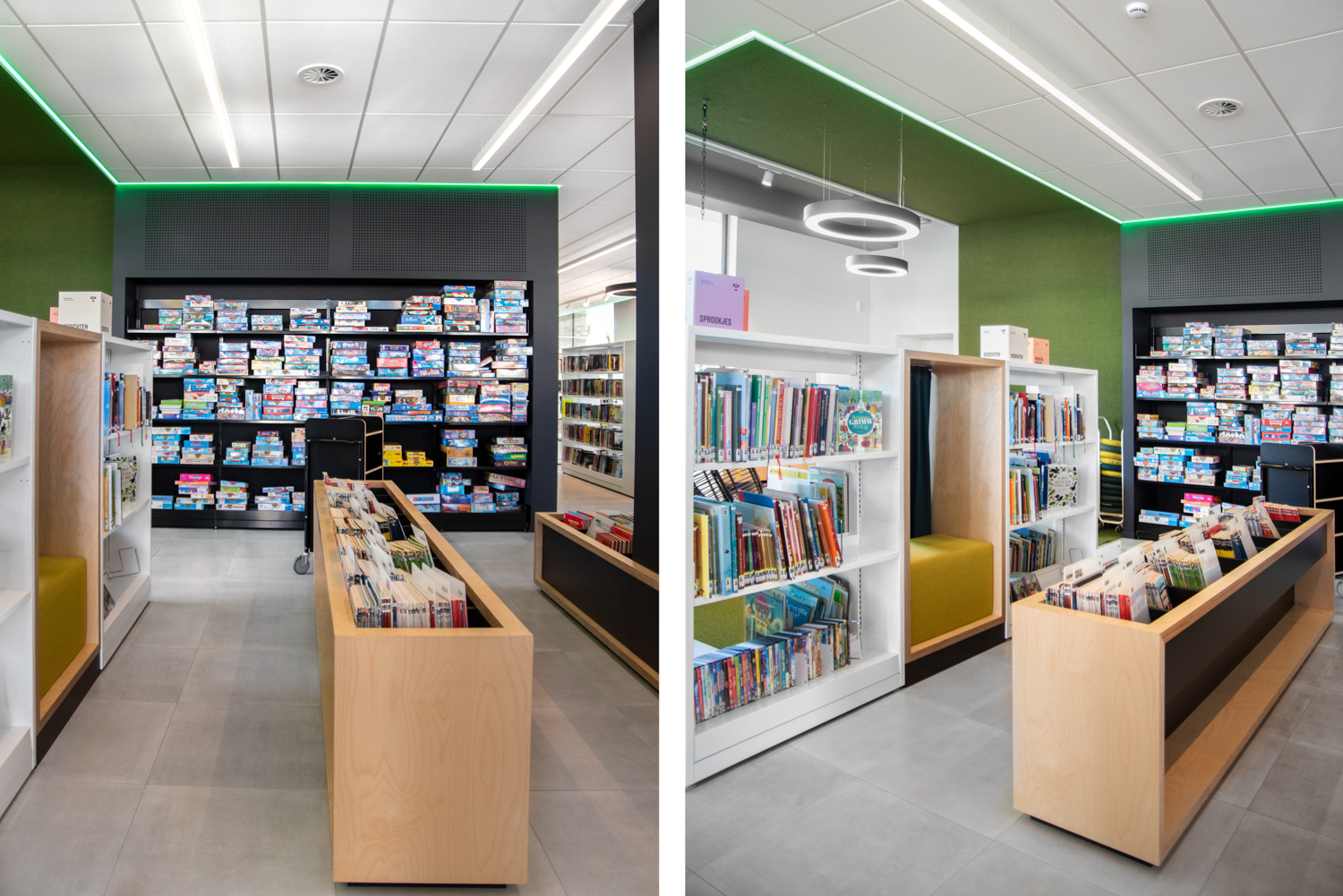 Bibliotekets hyllinredning går i svart och vitt för att dra uppmärksamheten till böckerna, medan de specialtillverkade biblioteksmöblerna tillför värme. De färgglada plastknubbarna bidrar med en frisk fläkt och vackra ljuseffekter i rummet. I biblioteket finns många stora fönster som släpper in dagsljuset.