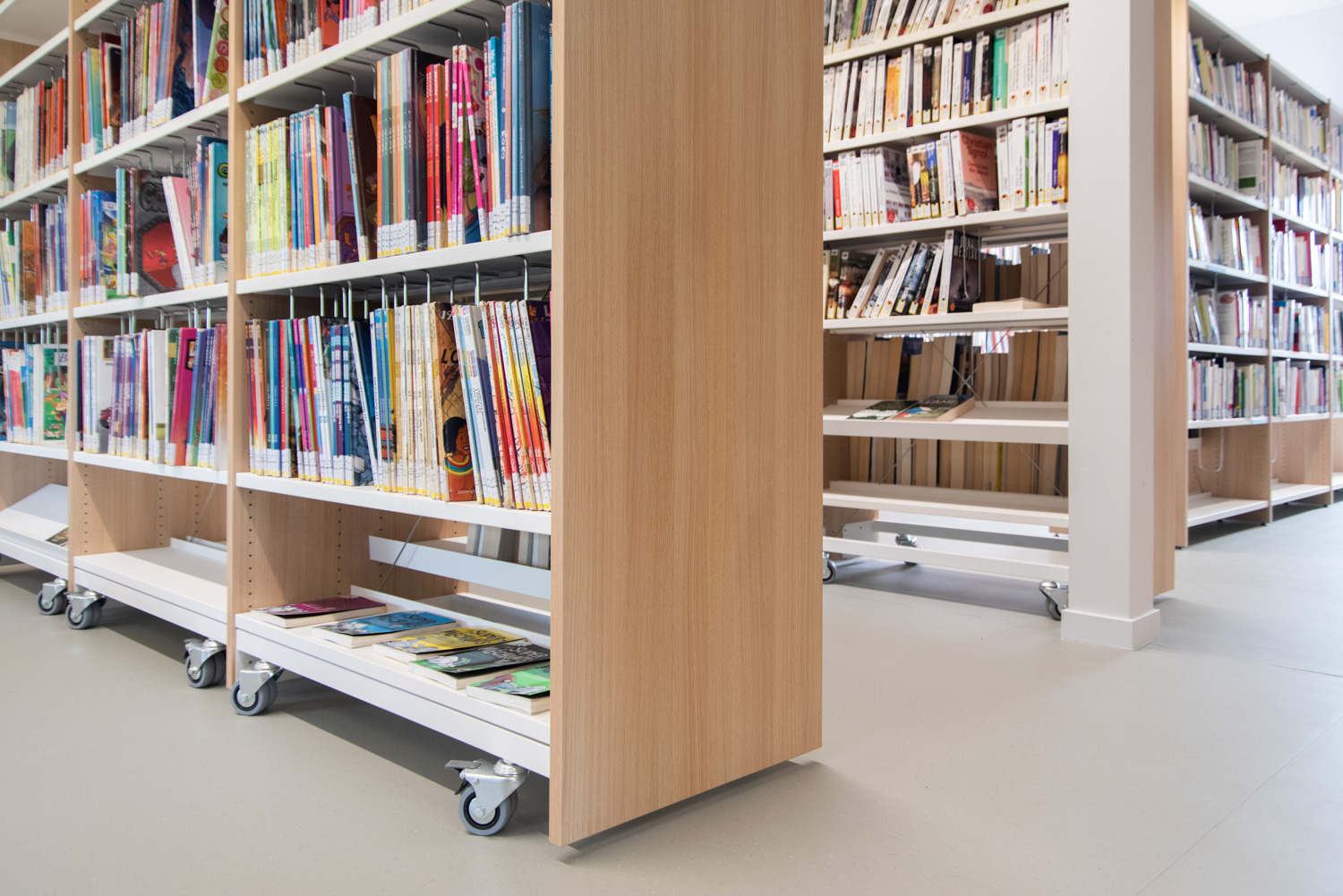 Florenville bibliotek är en del av ett kommunalt projekt med målet att samla olika aktörer i samma byggnad. Vid ingången står en stor disk som är lättillgänglig för besökare med nedsatt rörlighet. Hyllinredningen i trä framstår som elegant i kombination med de färgglada sittmöblerna.