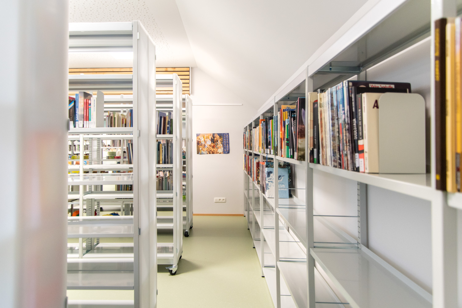 Inredningen är flexibel med bibliotekshyllor och exponeringstråg på hjul. Det finns sittområden för besökare i alla åldrar och en scen för de små barnen.