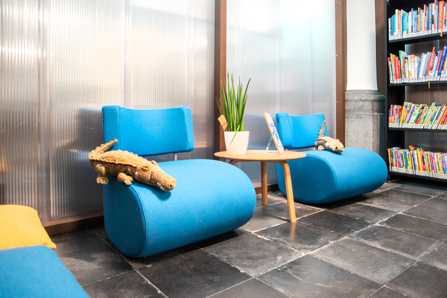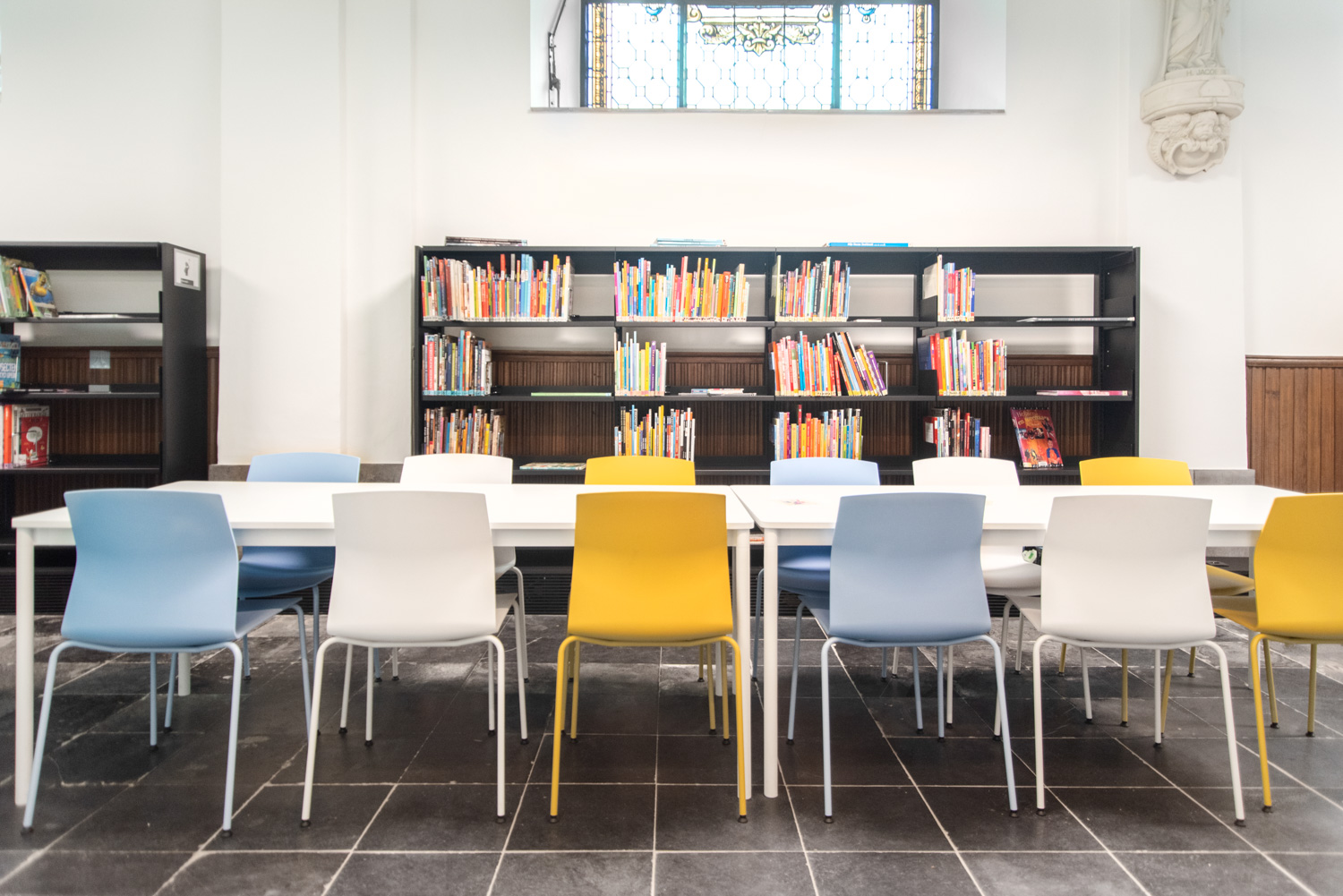 Rummen är smakfullt inredda med respekt för byggnaden: valven har bevarats och det karakteristiska, flödande ljuset från de stora glasmålningarna som är typiska för en kyrka bevaras genom glasväggar som skiljer biblioteket från de kyrkliga aktiviteterna.