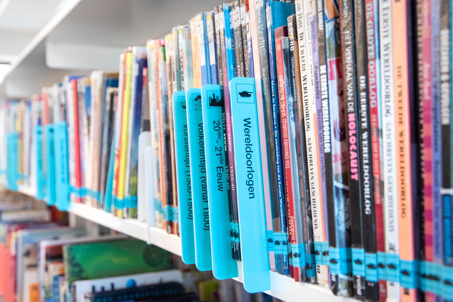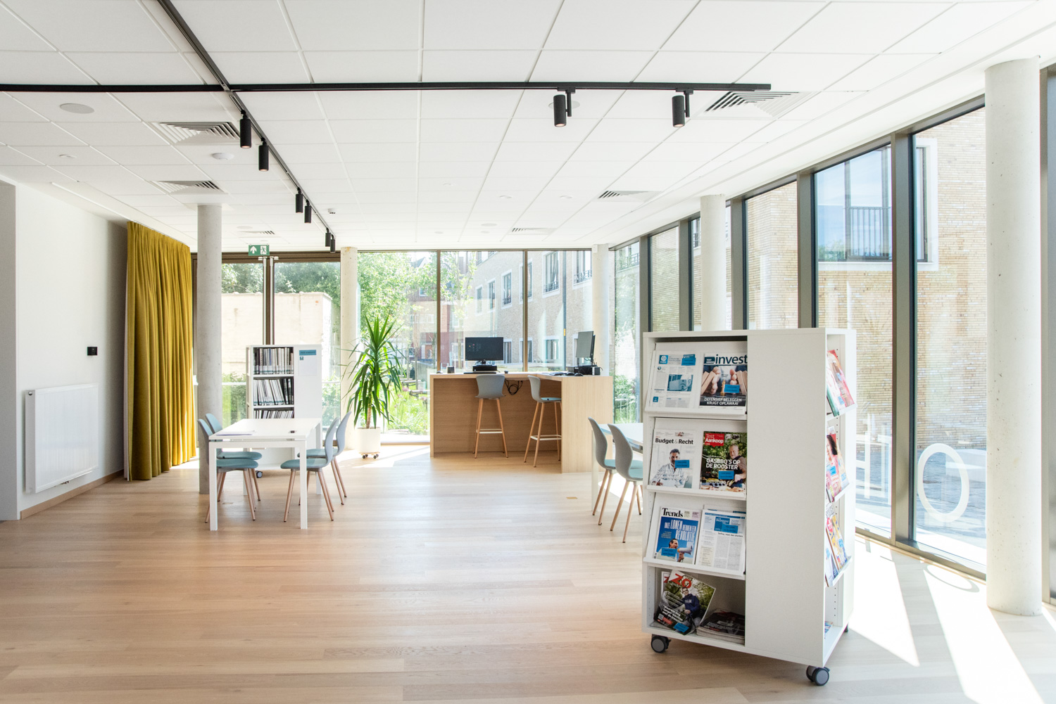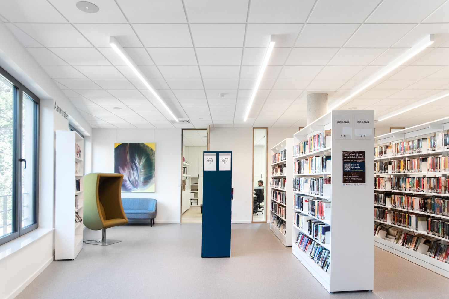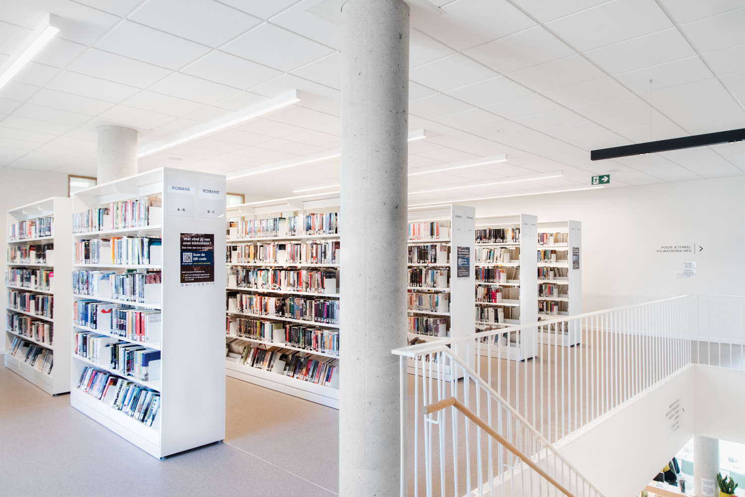 Bibliotekarien Elke Vandewalle säger: “Vi har skapat trivsamma sittområden på olika ställen i biblioteket där vi gärna uppmuntrar våra besökande att dröja sig kvar.” Läsesalen är också ett separat och trivsamt rum med längre öppettider än själva biblioteket. Samtidigt har vi försökt göra biblioteket så öppet som möjligt, bland annat genom att välja låga hyllor i rum med låga innertak.”