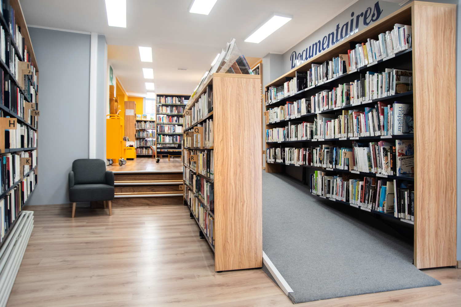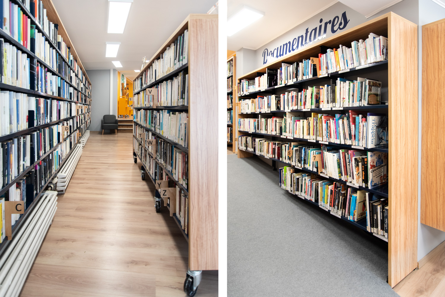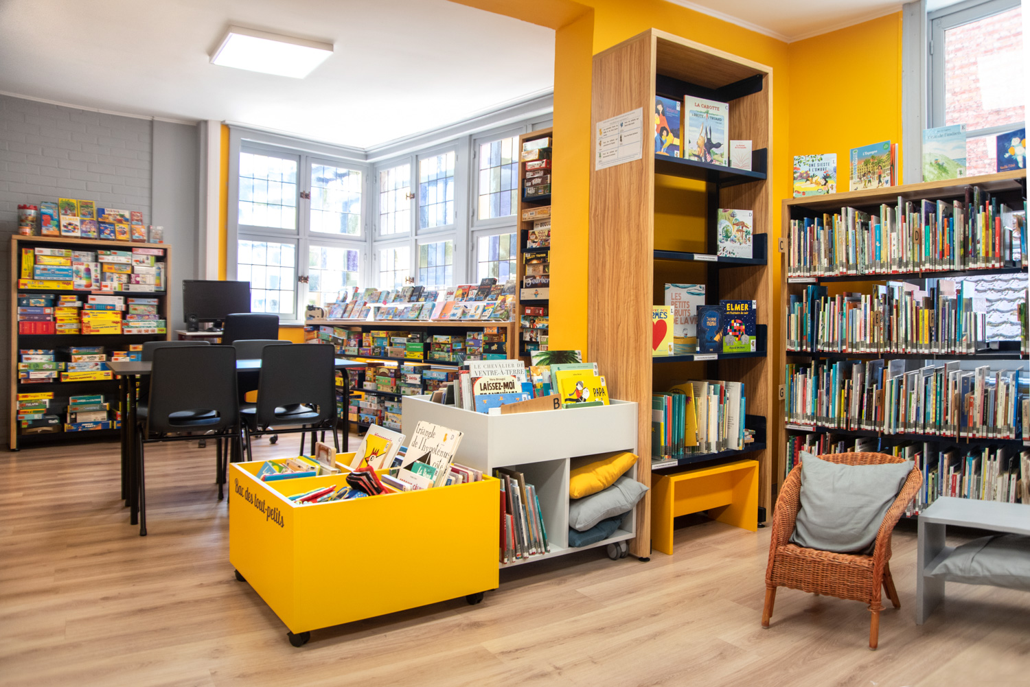 Detta säger bibliotekarien Noëlle Willem. I samarbete med sitt team har hon utnyttjat rummet och gjort biblioteksinredningen till en fröjd för ögat som gör att fler får lust att besöka biblioteket samtidigt som de lättare finner biblioteksmaterialen. Färgvalet är modernt och materialvalet i trä och metall hållbart.