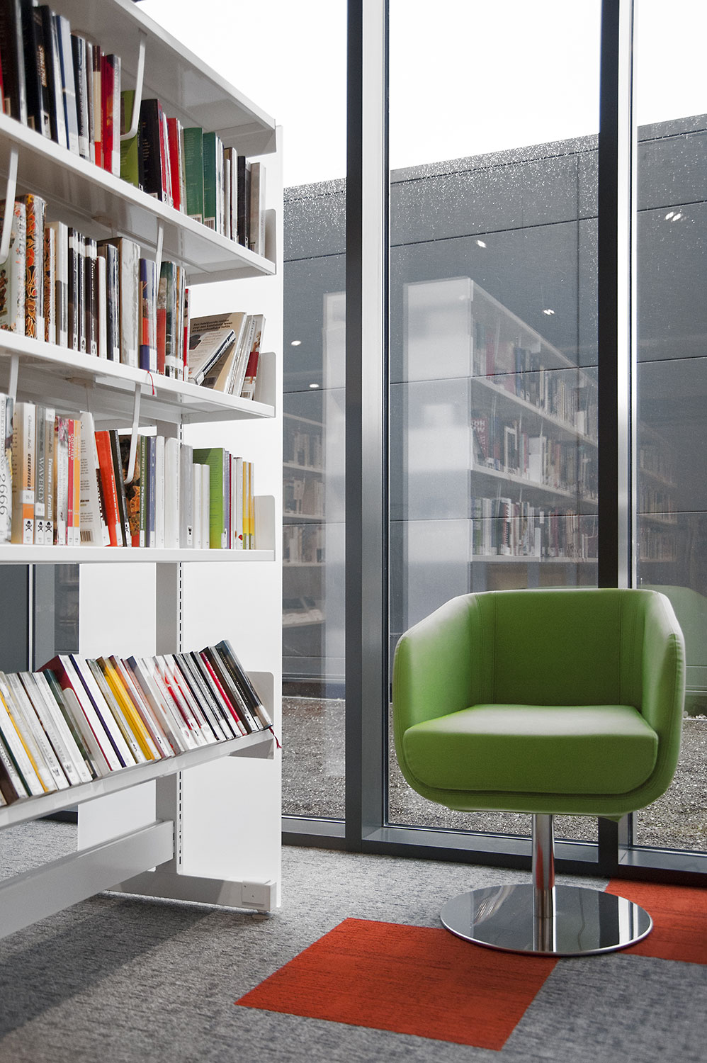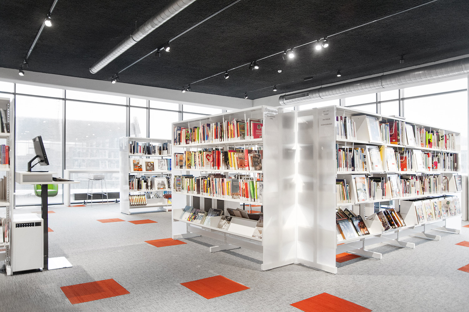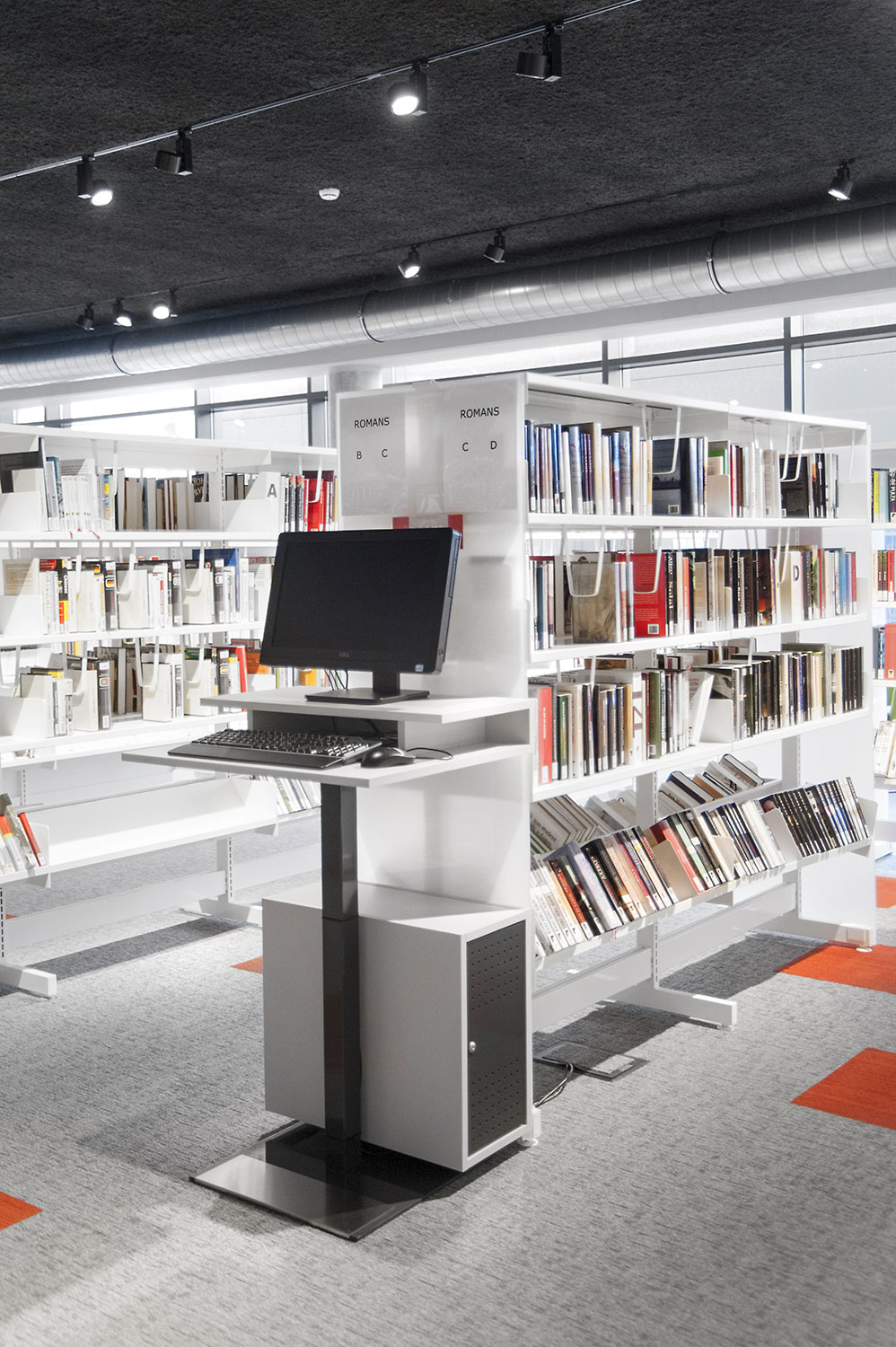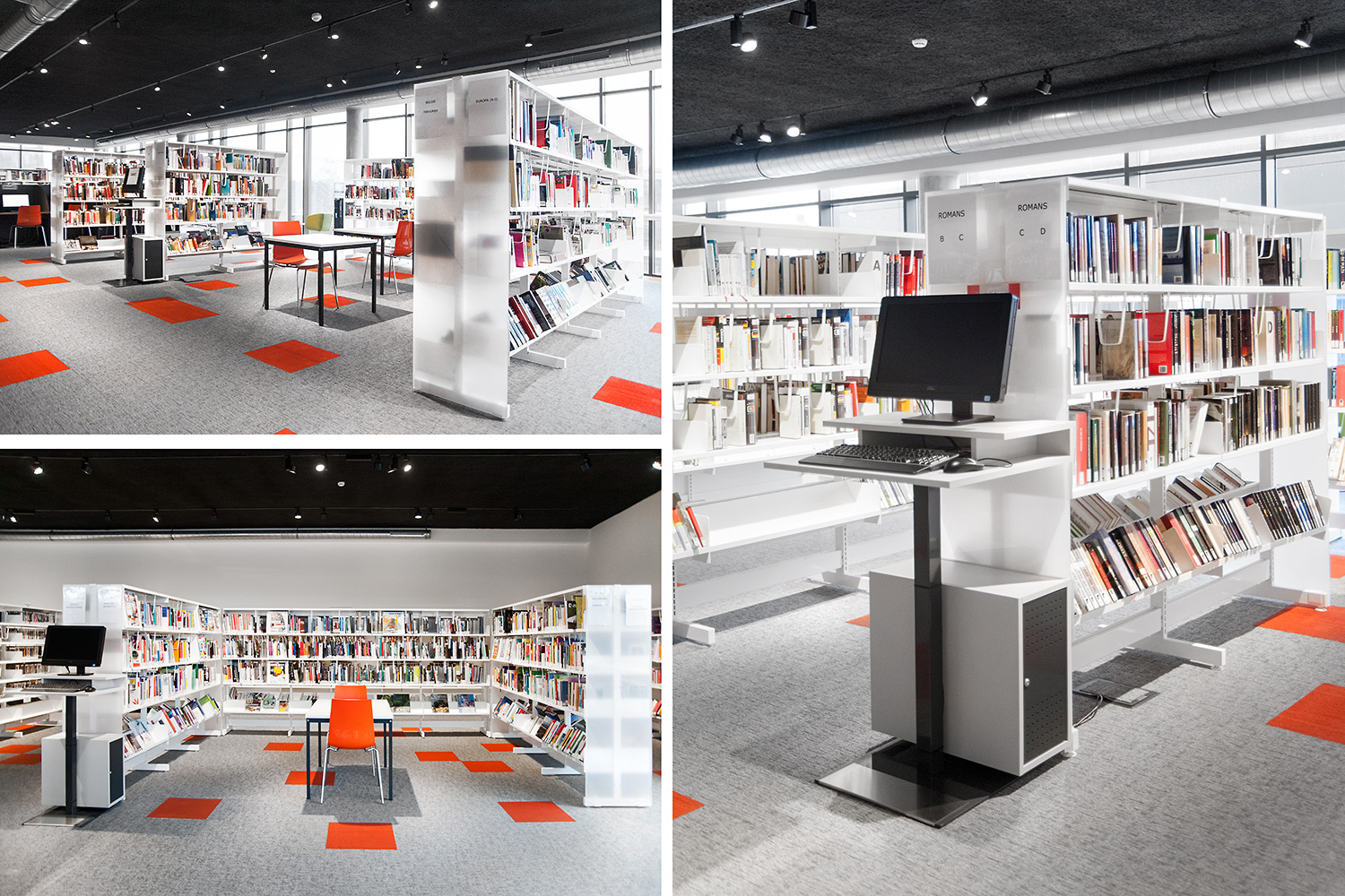 Vid utformningen av bibliotekets inredningslösning låg extra fokus på det ergonomiska hyllsystemet, på barnavdelningen och dess sittplatser samt på bibliotekets läs- och studieplatser.