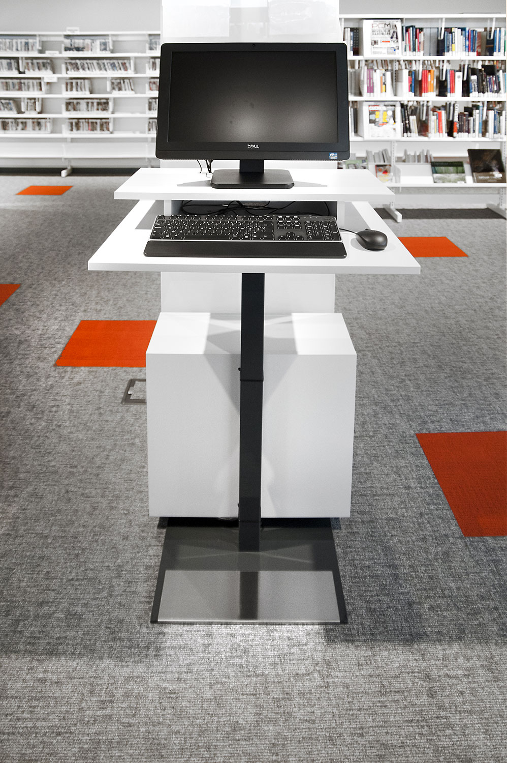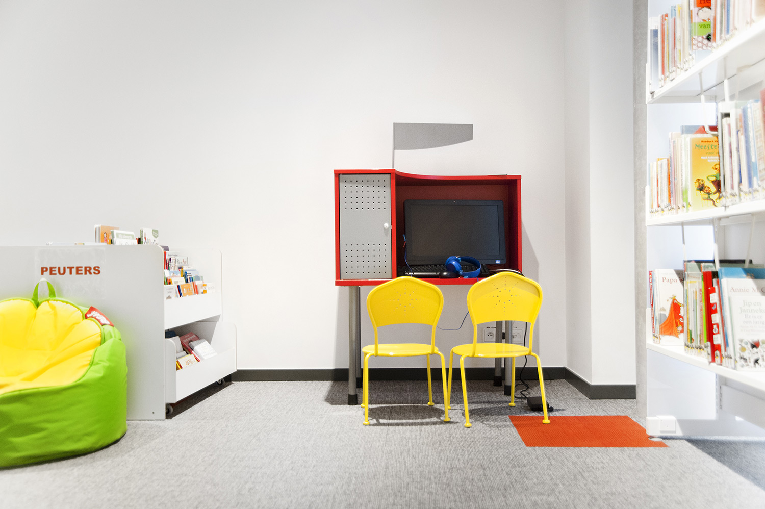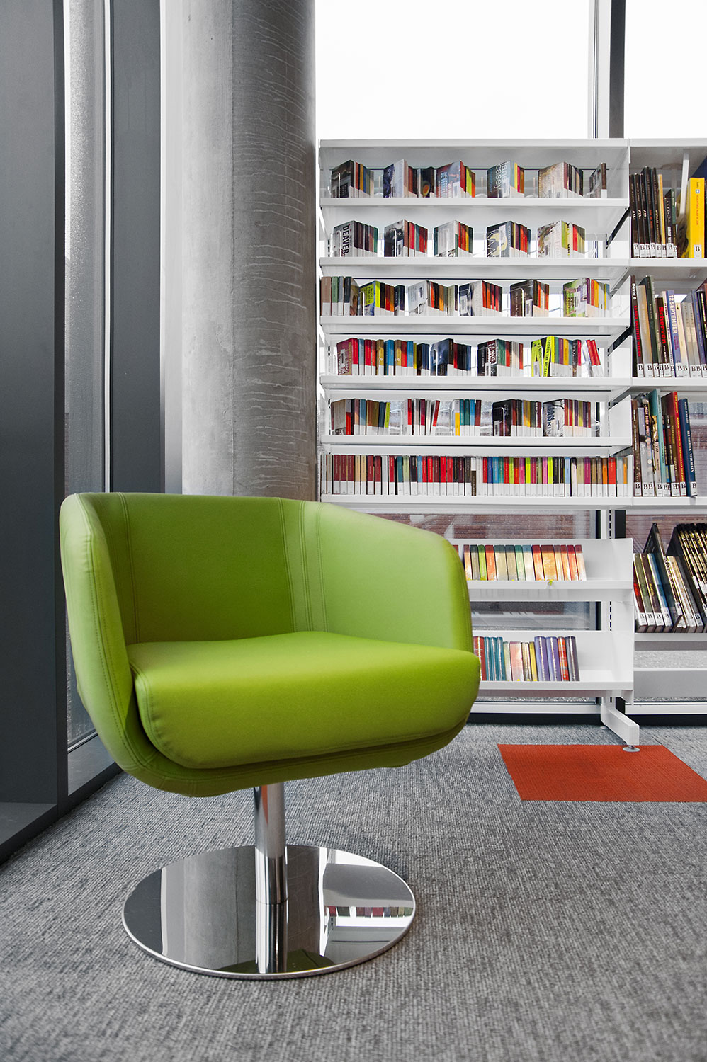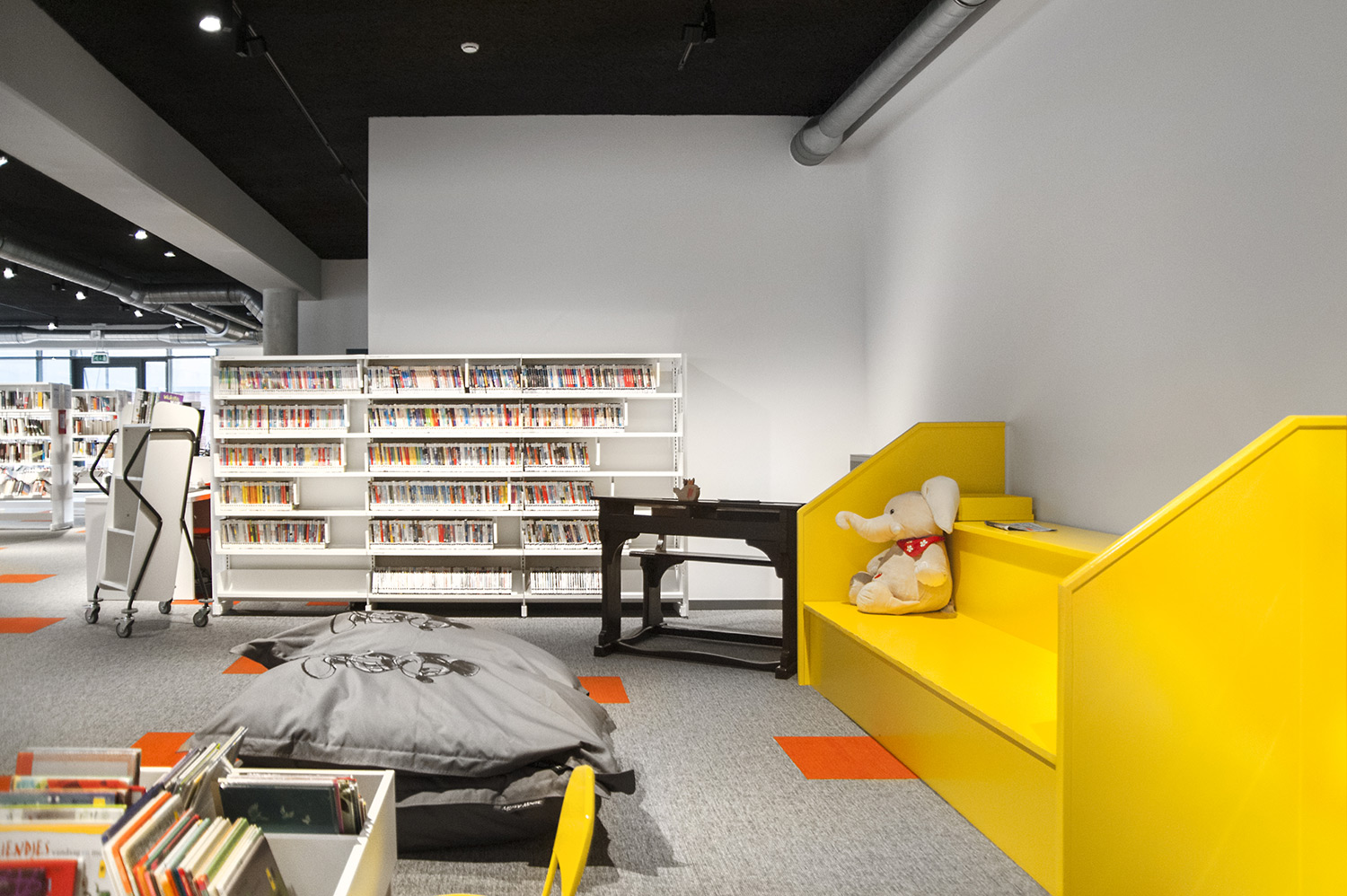 Vid utformningen av bibliotekets inredningslösning låg extra fokus på det ergonomiska hyllsystemet, på barnavdelningen och dess sittplatser samt på bibliotekets läs- och studieplatser.