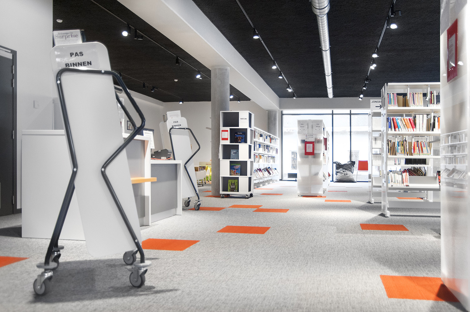 Byggnadens svarta innertak står i effektfull kontrast till den vita inredningen som på ett självklart sätt formar miljön tack vare dess begränsade höjd och raka design.