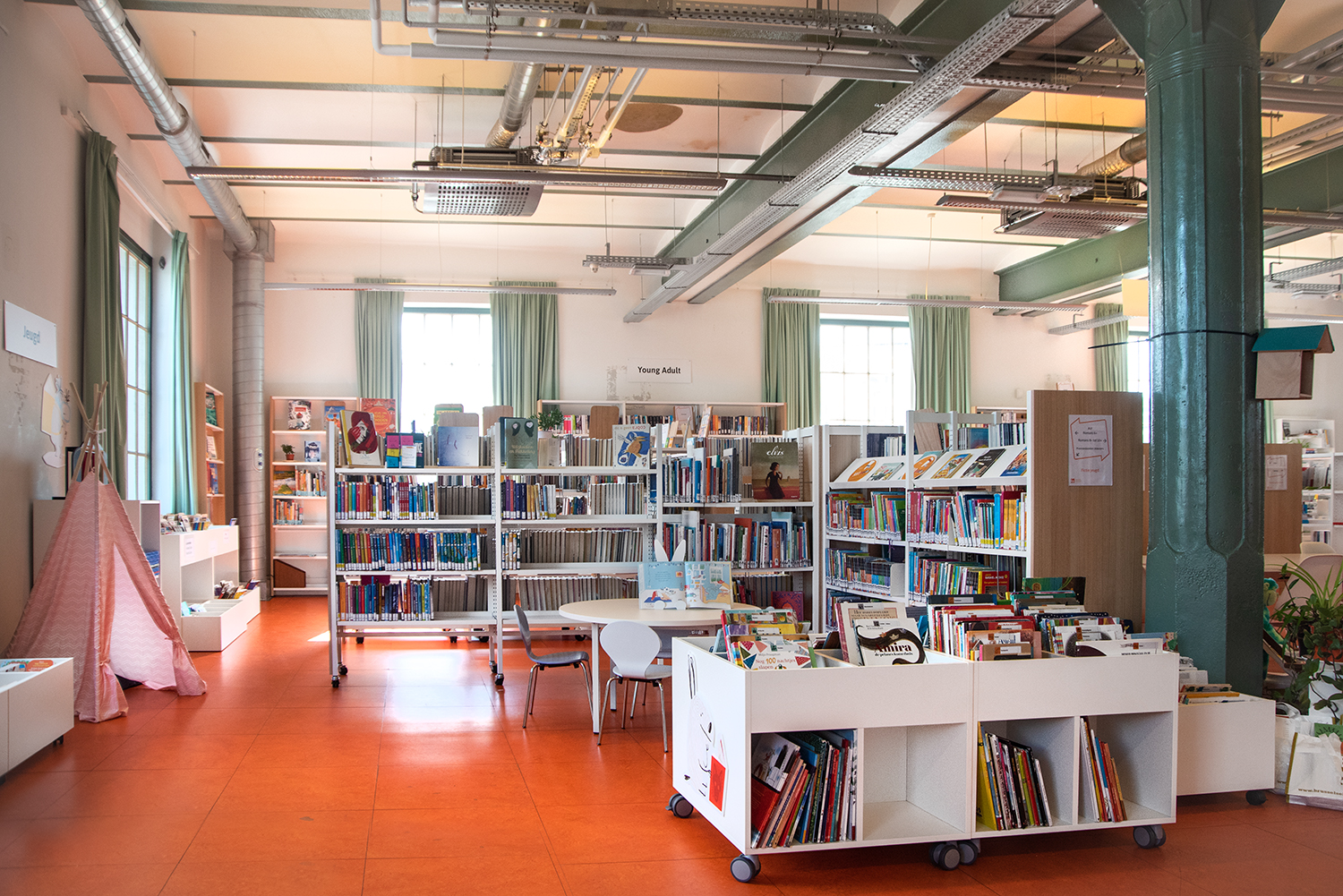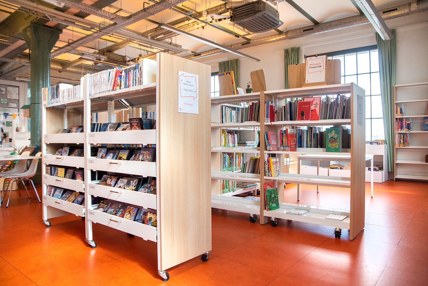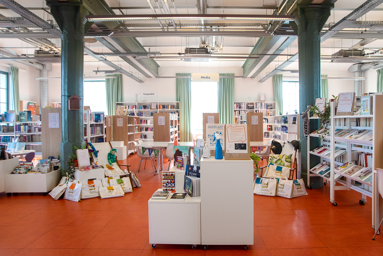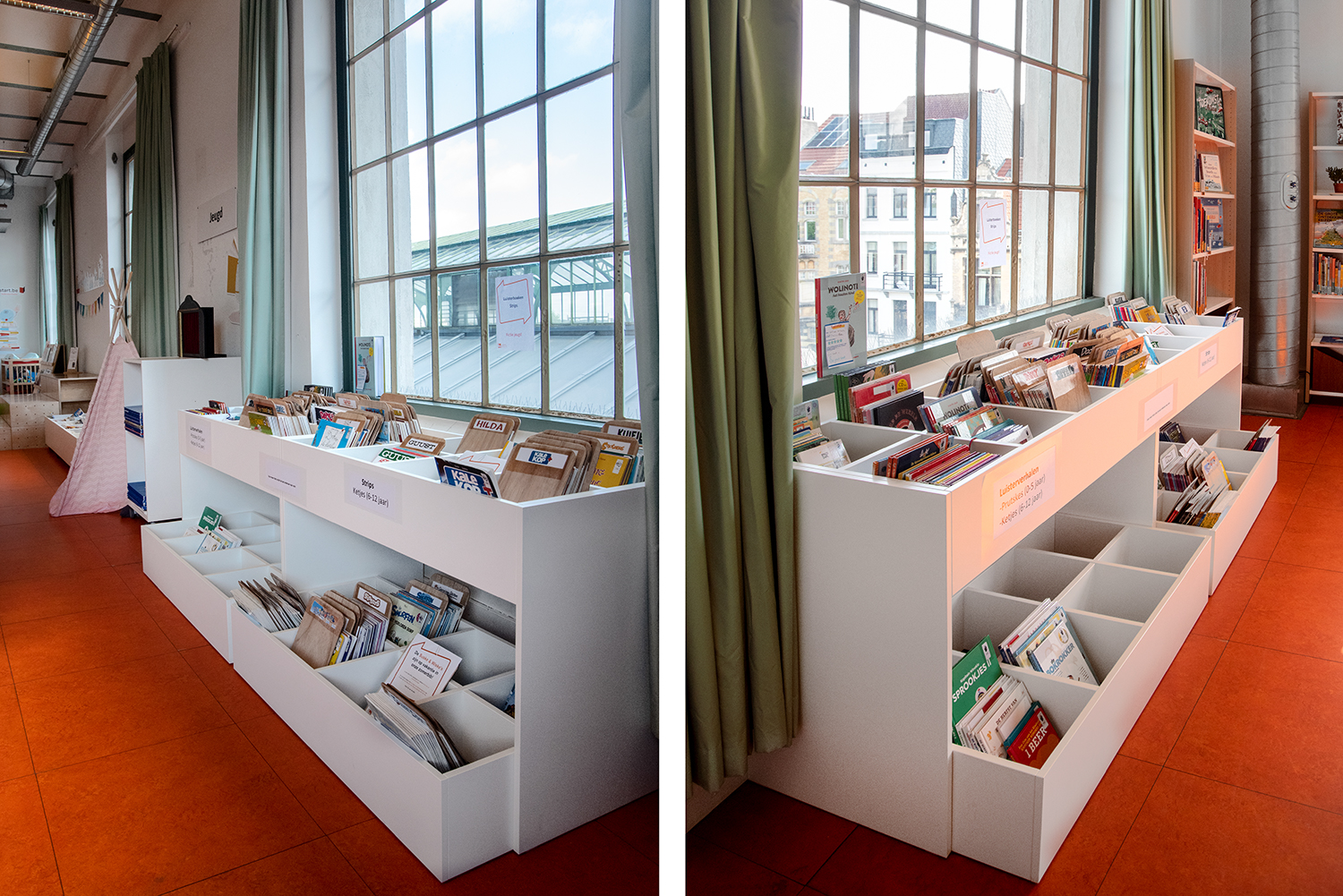 Bibliotekarien Elise Ghyselen säger: ”Vårt bibliotek är ett äkta familjebibliotek. Därför var det viktigt att inredningen anpassades till vår unga och mångsidiga publik, som talar åtskilliga språk. Tydlig och visuellt tillgänglig skyltning var avgörande.”