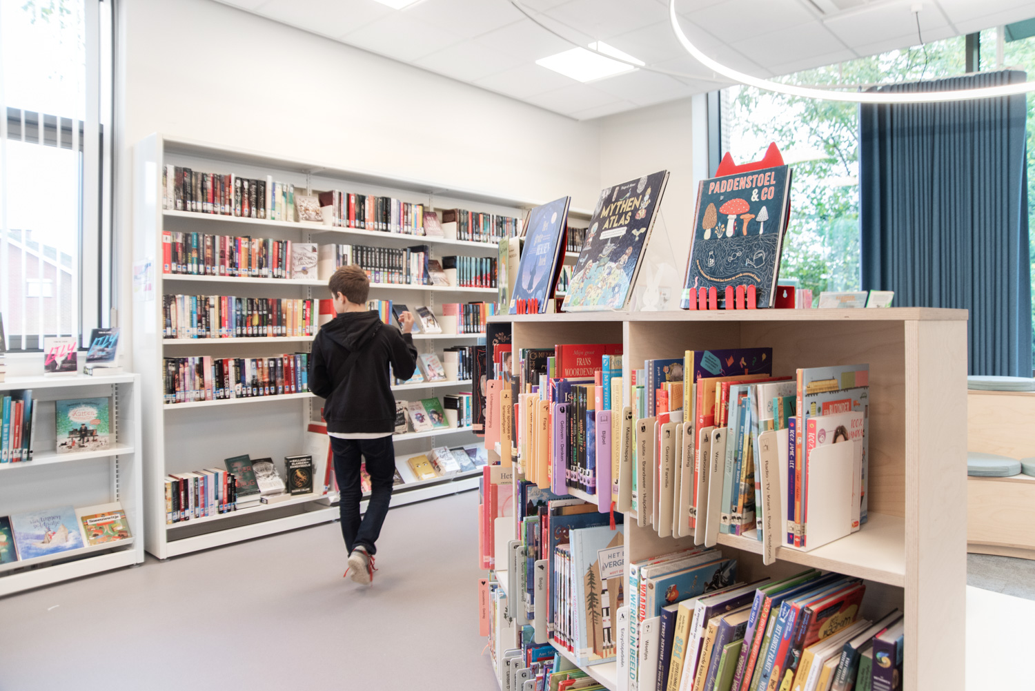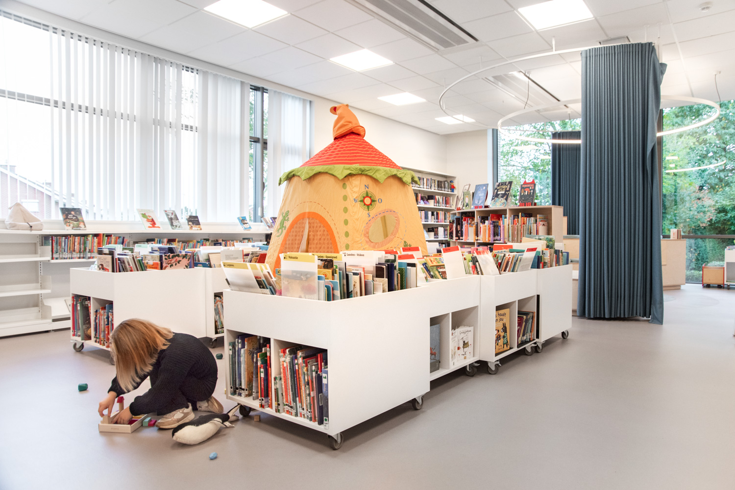 Böckerna presenteras på specialtillverkade hyllor som är särskilt utformade för att tillgodose behoven i det lokala samhället. De nedre hyllplanen är vinklade så att böckerna är lätta att nå. Samtidigt säkerställer kombinationen av trädetaljer och vita ytor att böckerna förblir i fokus.