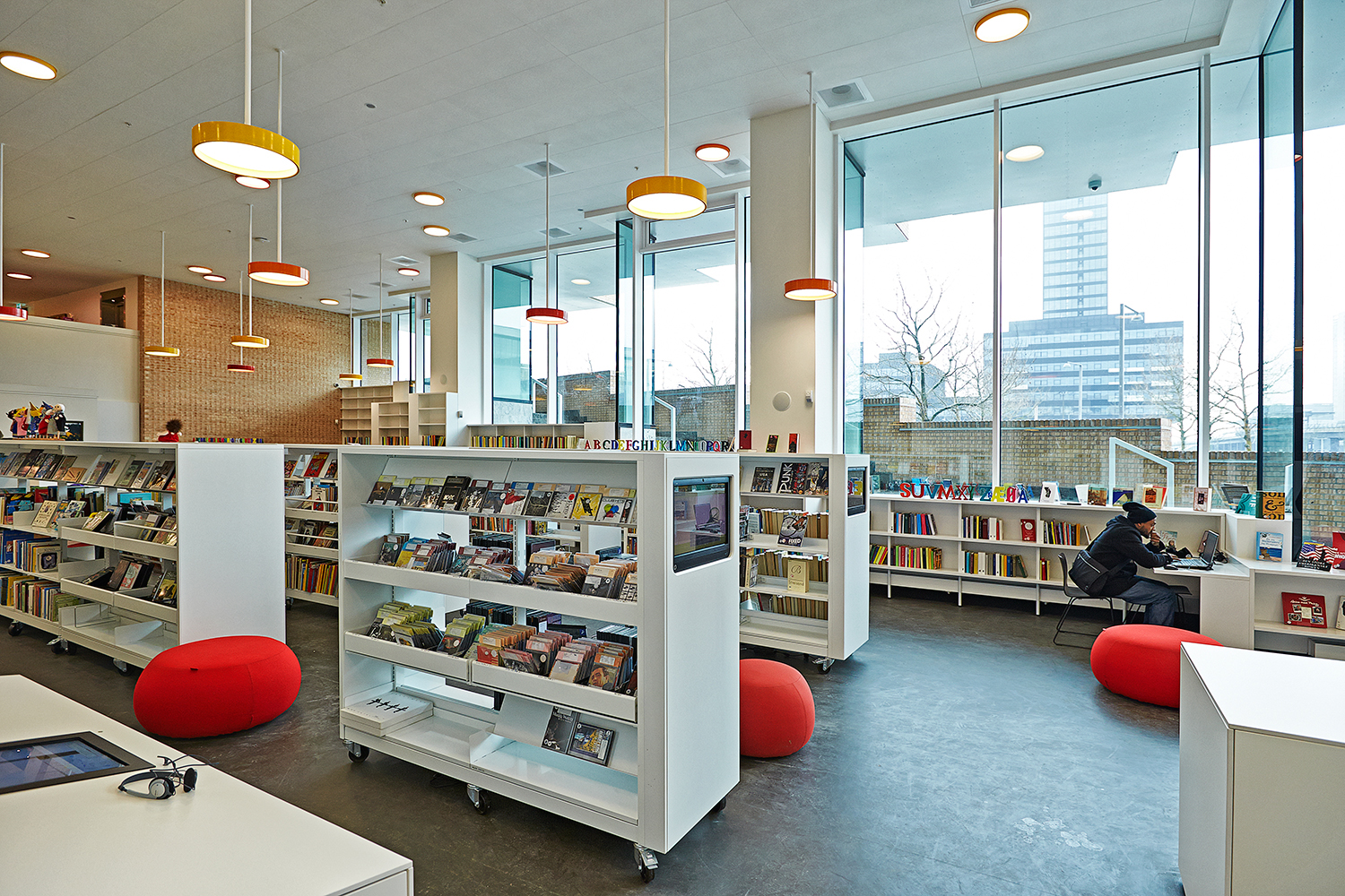 Inredningsstilen fokuserar på flexibilitet och multifunktionella lösningar. Biblioteket kan förvandlas från att vara ett skolbibliotek på dagen till att vara ett folkbibliotek på eftermiddagen. På kvällen öppnar det upp som ett kulturcentrum med plats för föreställningar, föredrag, film och annat.
