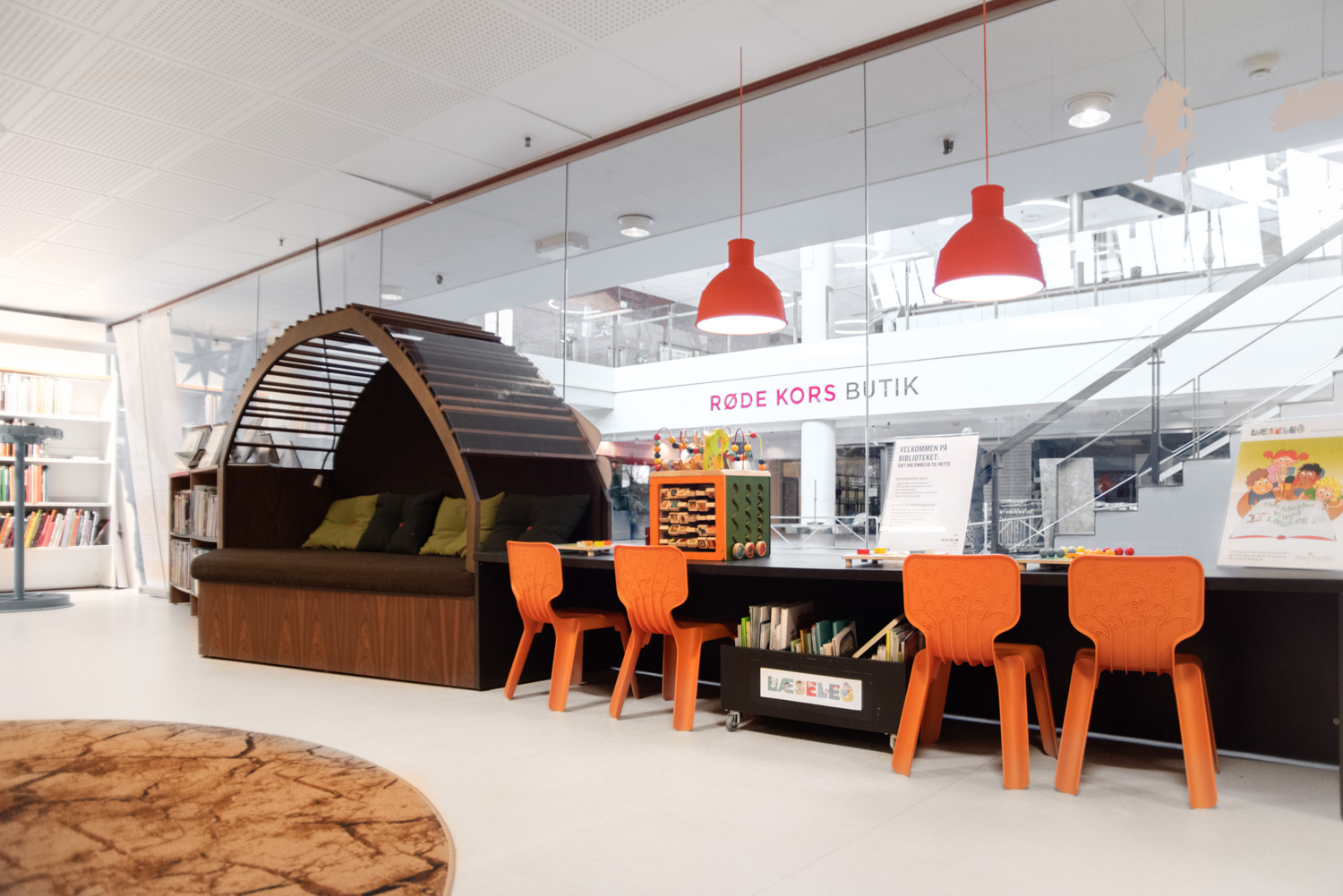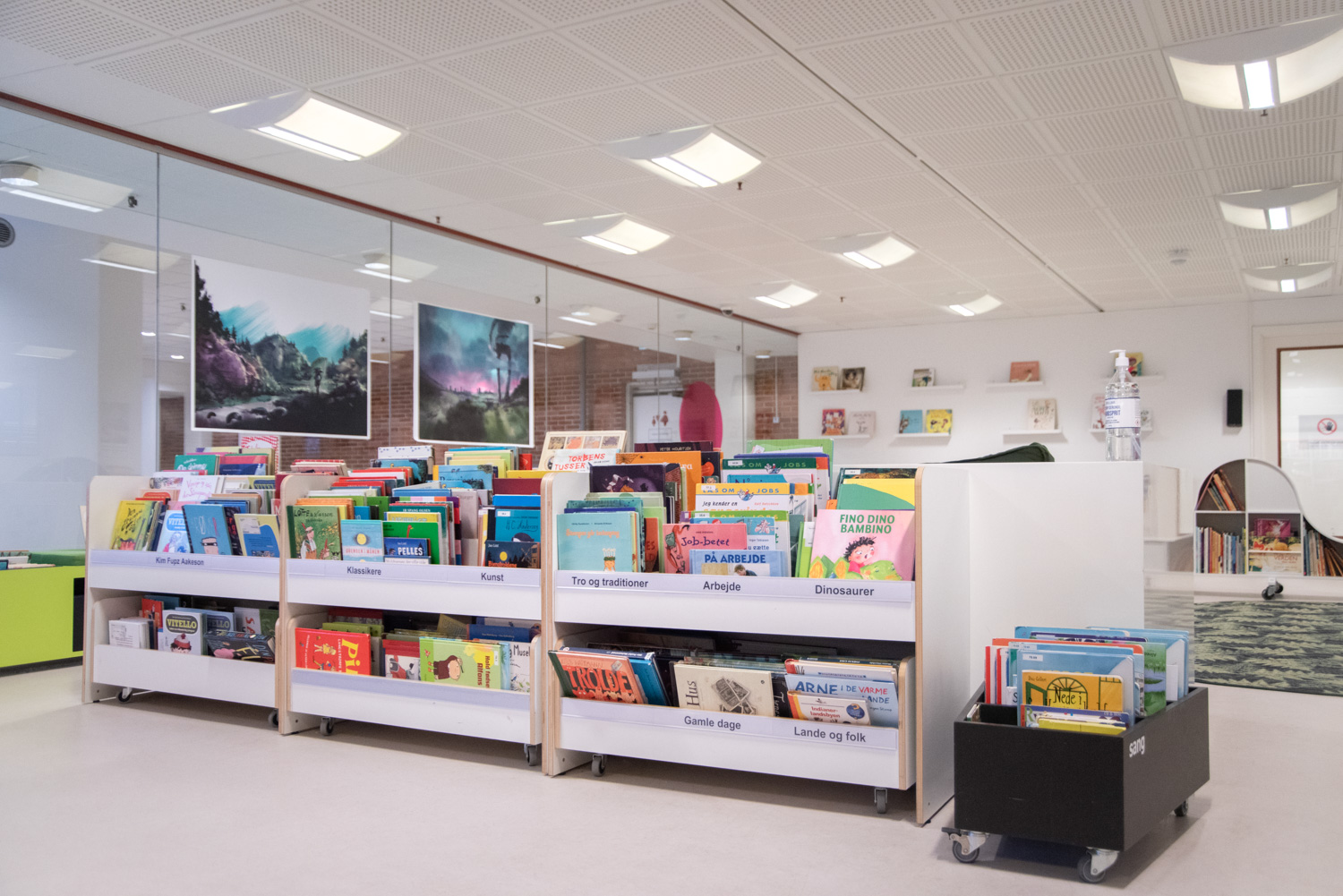 Arkitekter från Lammhults Biblioteksdesign valde att kombinera de existerande komponenterna med bland annat en djungelhydda och ett ritbord. Dessutom har soffan, boktrågen och hyllorna fått en lite annorlunda placering samtidigt som två djungelmattor och puffar fulländar djungeltemat, som kan användas av de mindre barnen till både lek och uppehåll. Hos de större barnen har fönsterpartiet utnyttjats till en lång vinklad bänk-bordmöbel som rymmer datorplatser och tråg till medier, så nu finns det mycket mer plats för att läsa och vara.