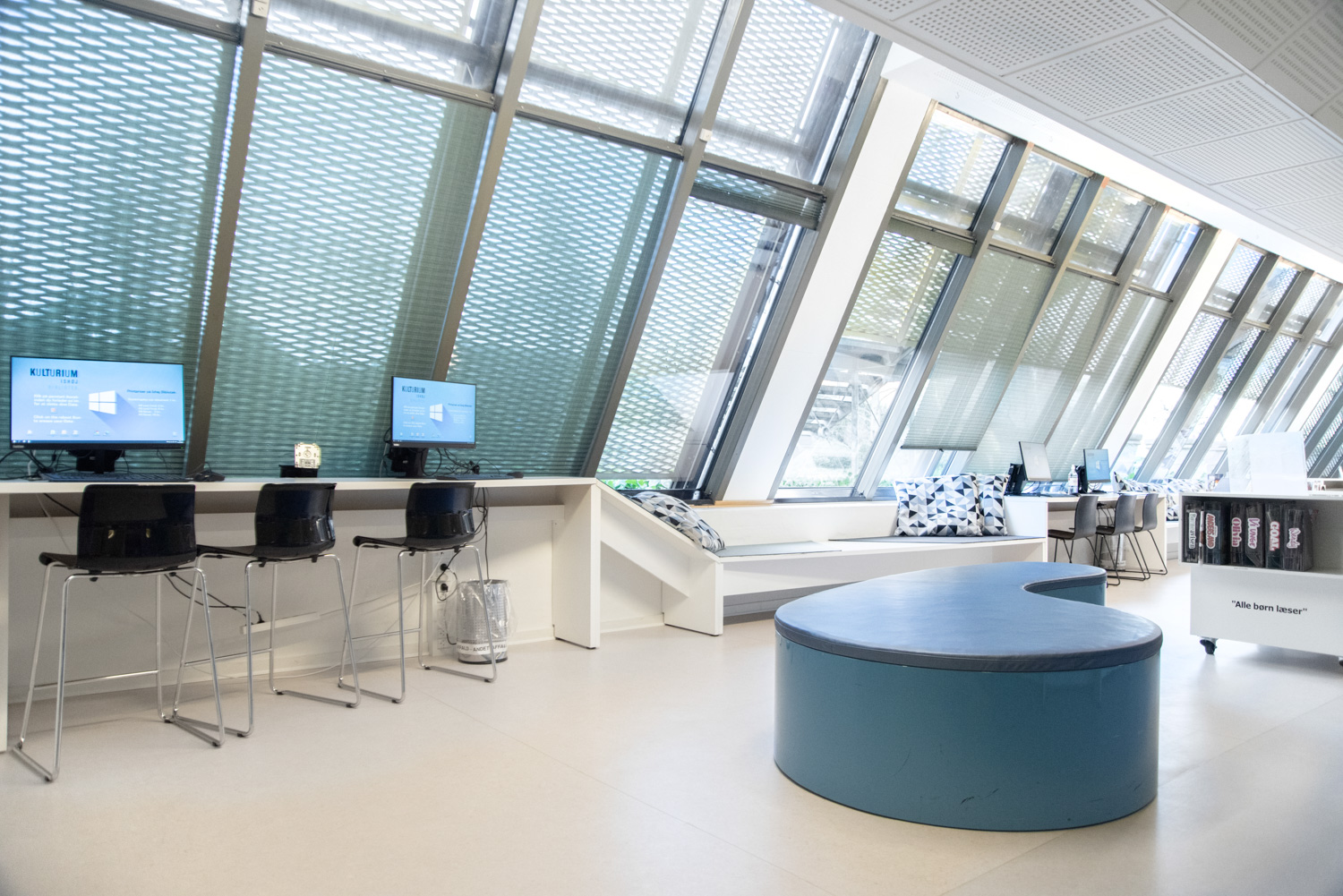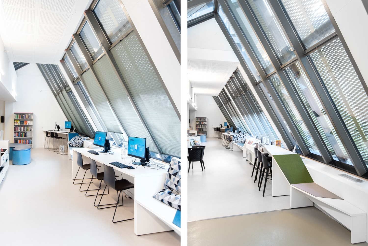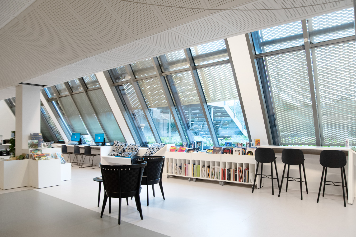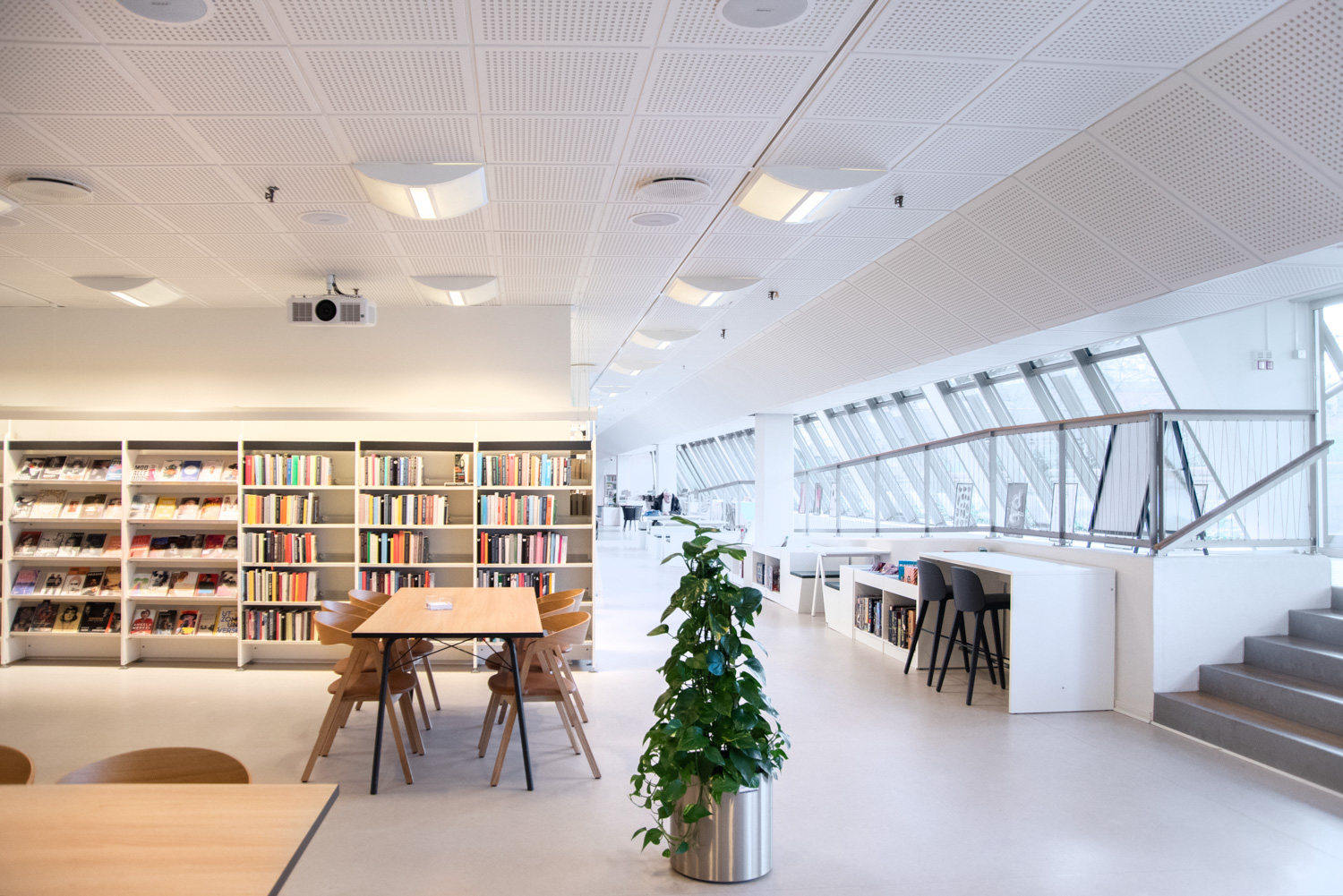 Brädspels- och utlåningsområdena förnyas under 2022 så att biblioteket framöver kommer framstå som en välkomnande grön stadsträdgård. Tidigare hade biblioteket ett outnyttjat gångstråk längs en ramp med stora fönster och massor med dagsljus, som nu ska användas till ett trivsamt brädspelscaféområde.