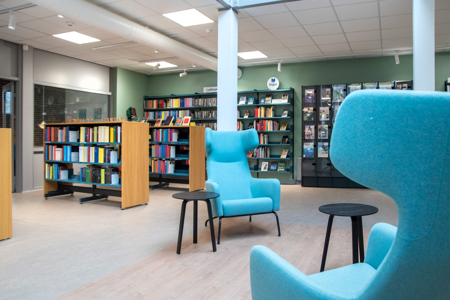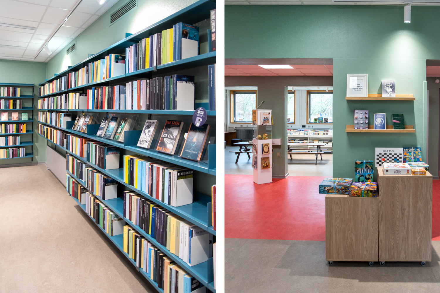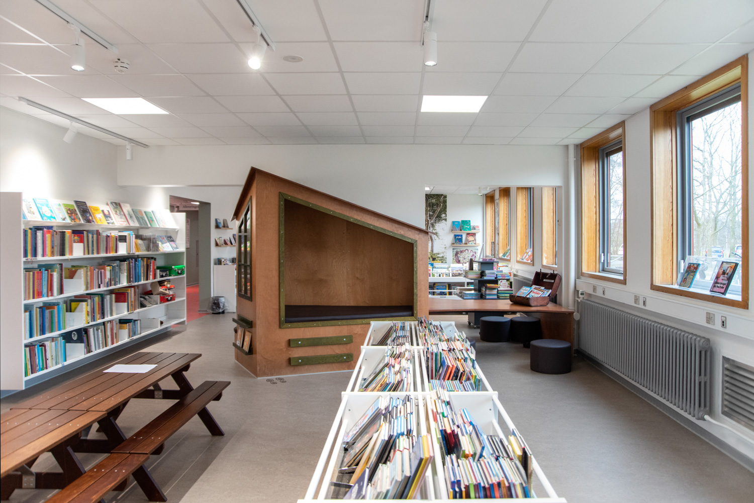 Biblioteket bygger på värderingar om återbruk och hållbarhet så byggnaden är renoverad och de gamla hyllorna har återanvänts. En husarkitekt har stått för renoveringen medan Lammhults Biblioteksdesign har stått för väggfärger och inredning. Genom att modernisera hyllorna med nya gavlar och placera de blå och röda hyllorna strategiskt i förhållande till det nya röda golvet har biblioteket idag en välkomnande och unik färgsättning.