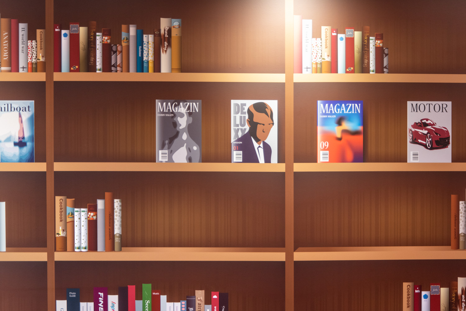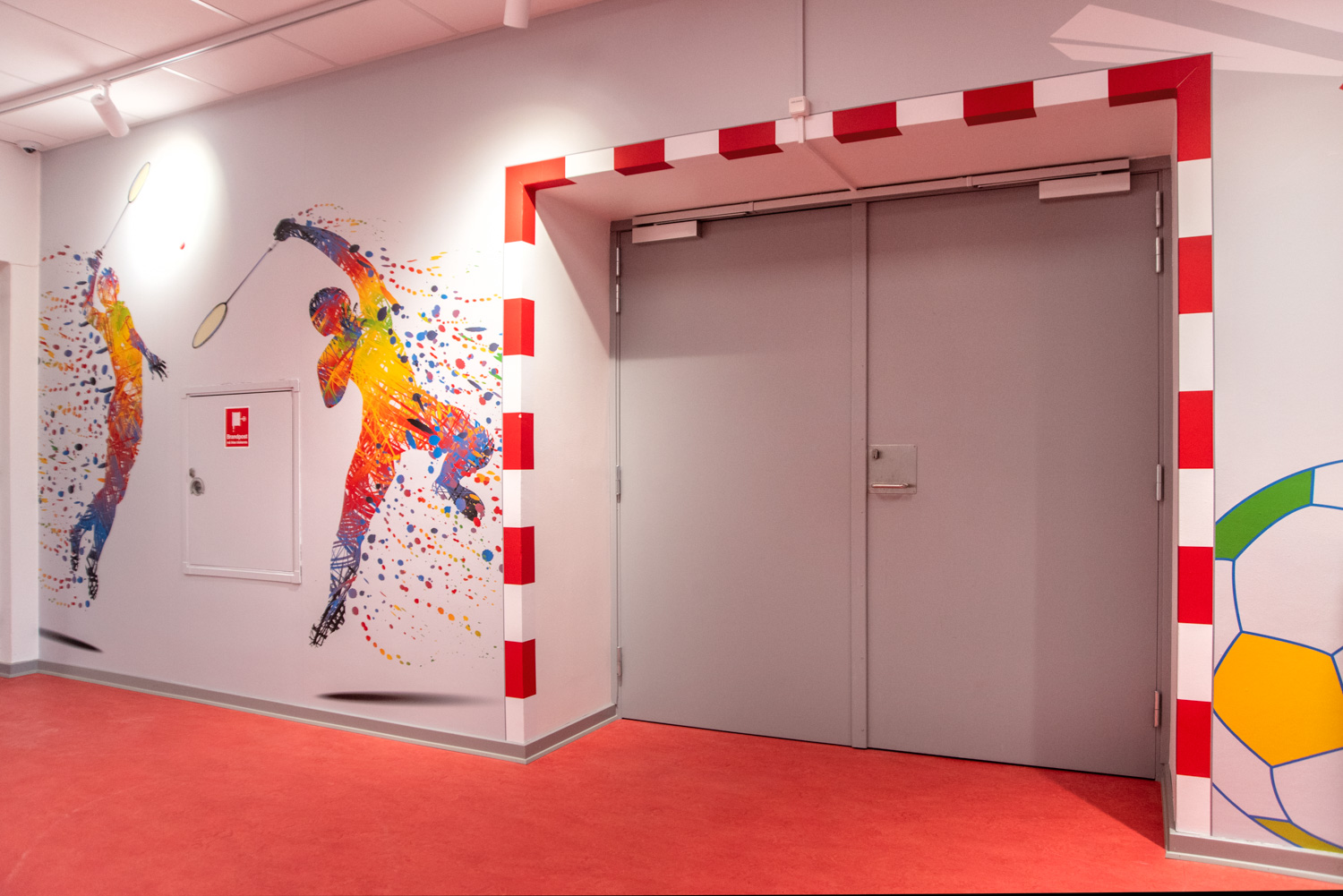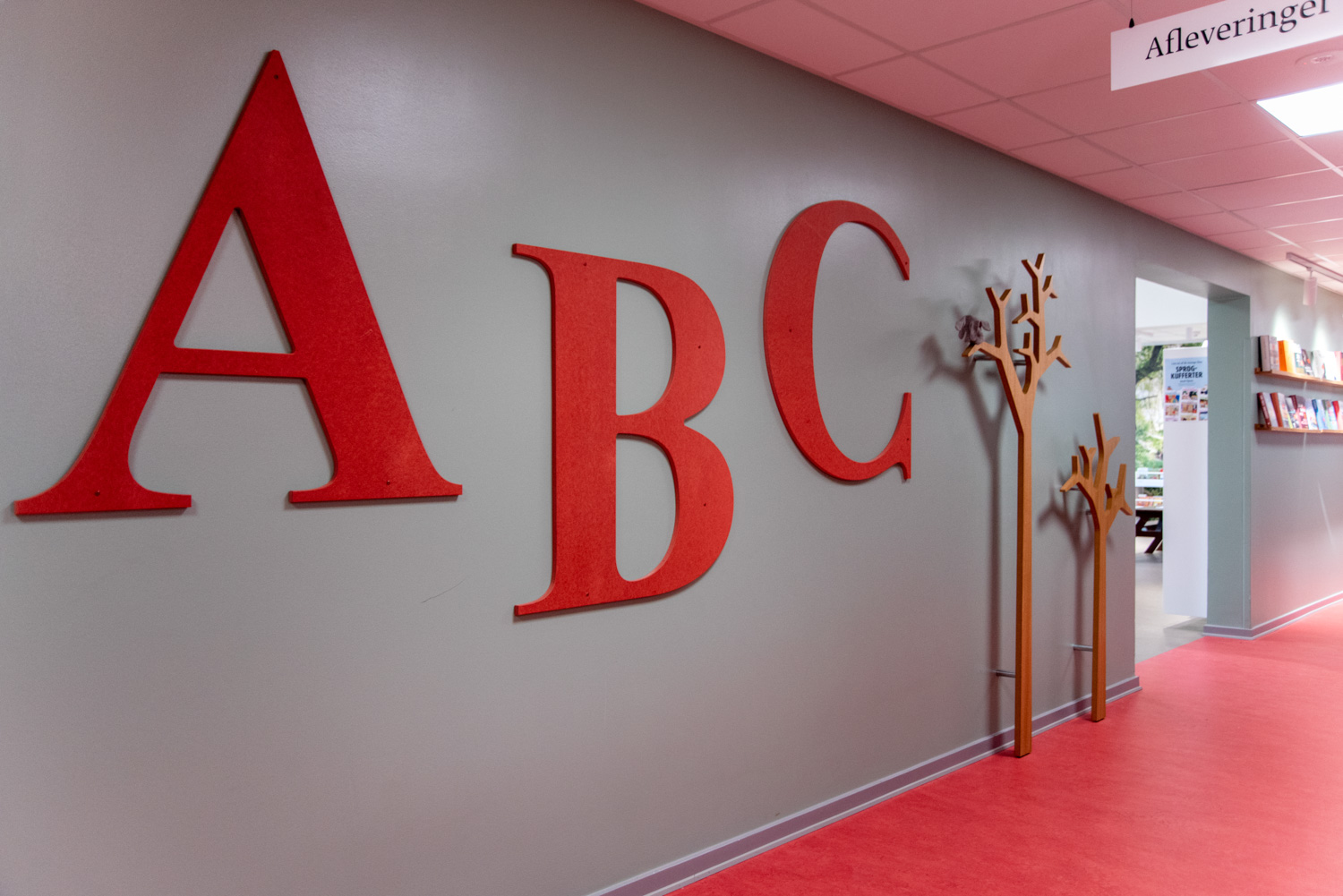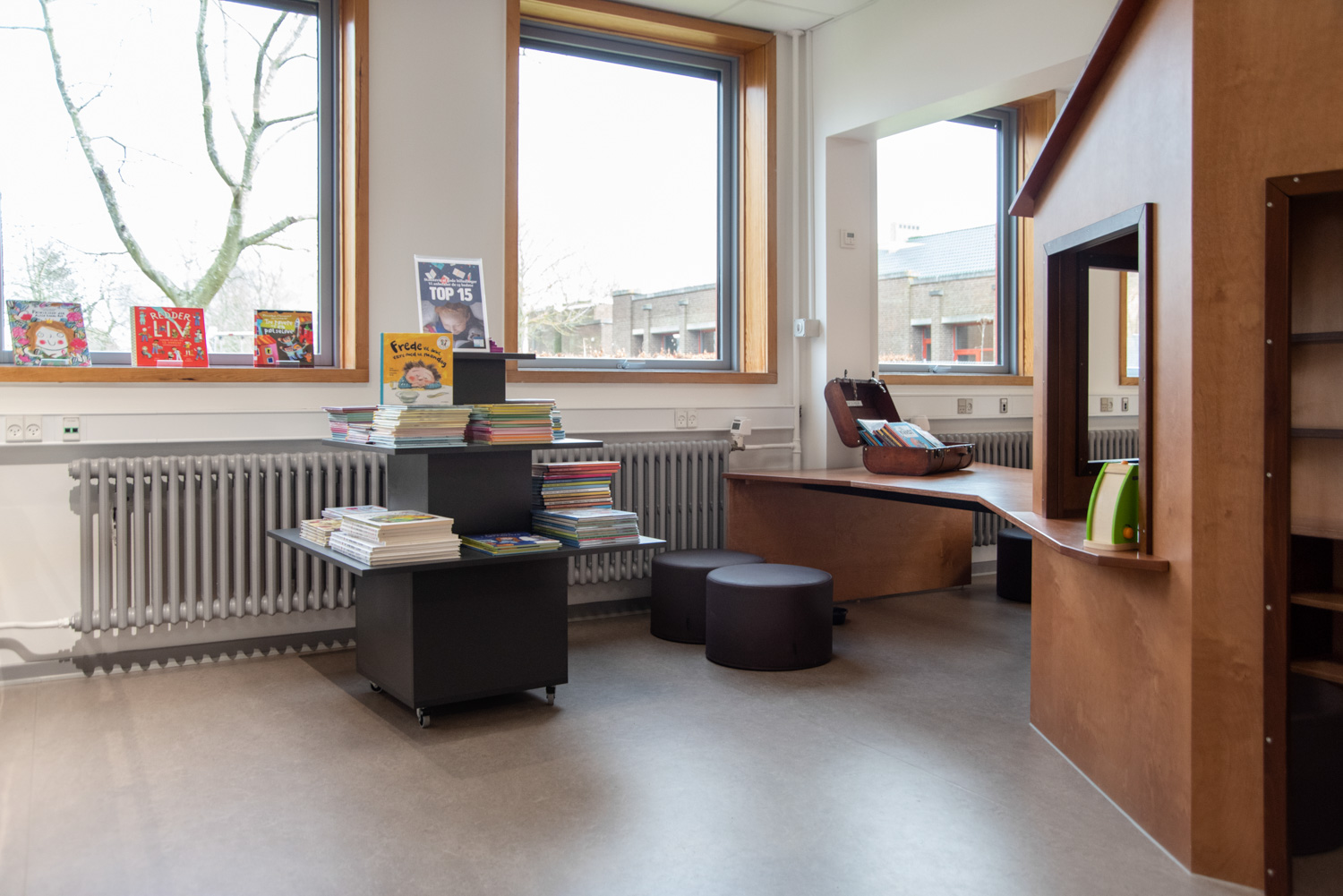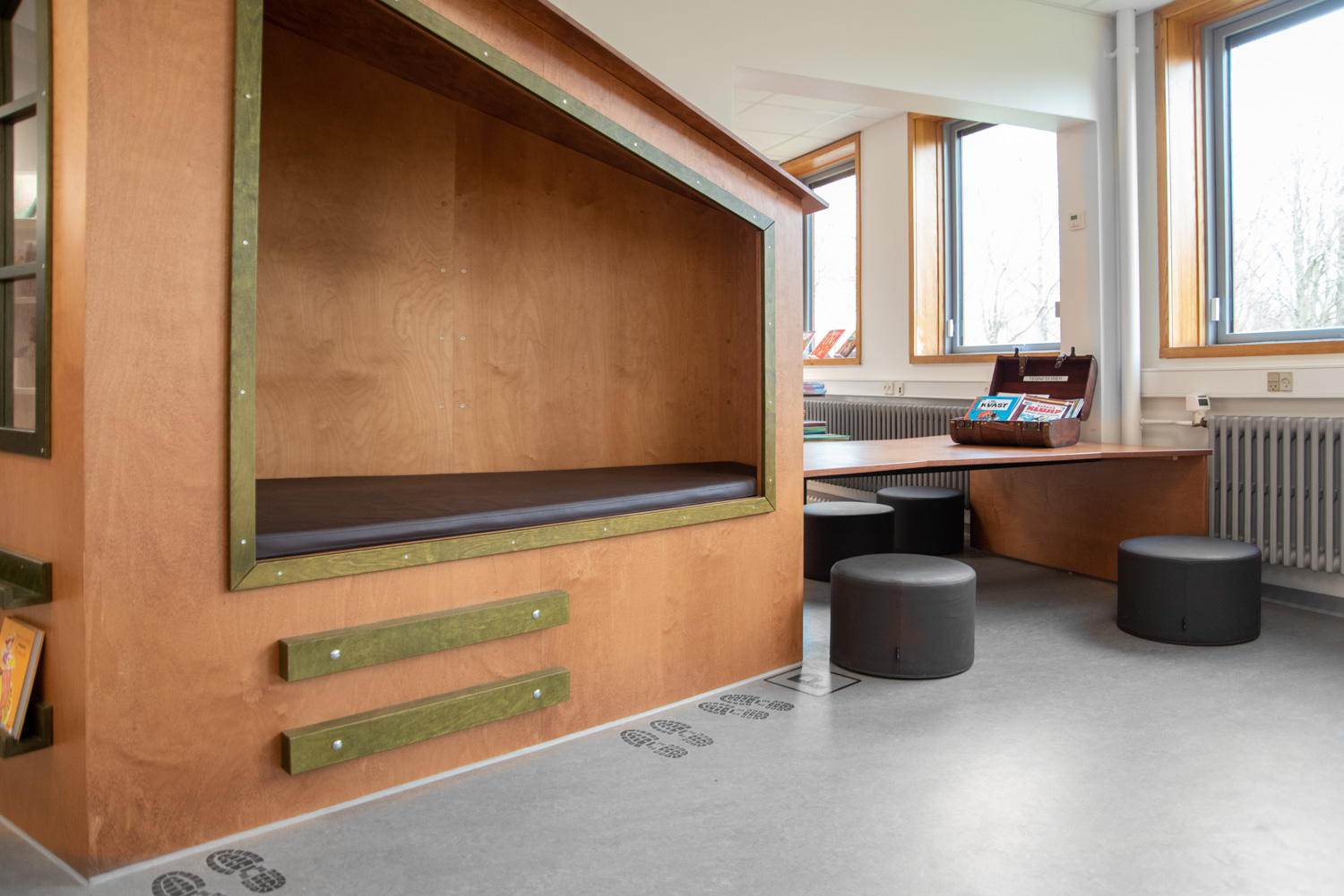 När man kommit in i biblioteket möts man av ett livligt loungeområde med väggfolier som tydligt visar vart man ska om man ska träna eller till biblioteket. På barnavdelningen ger en väggfolie känslan av att gå in i en skog. Detta understryks av små stolar gjorda av kapade trädstammar samt en hydda där barnen kan sitta i en lugn omgivning och ägna sig åt böckernas värld.