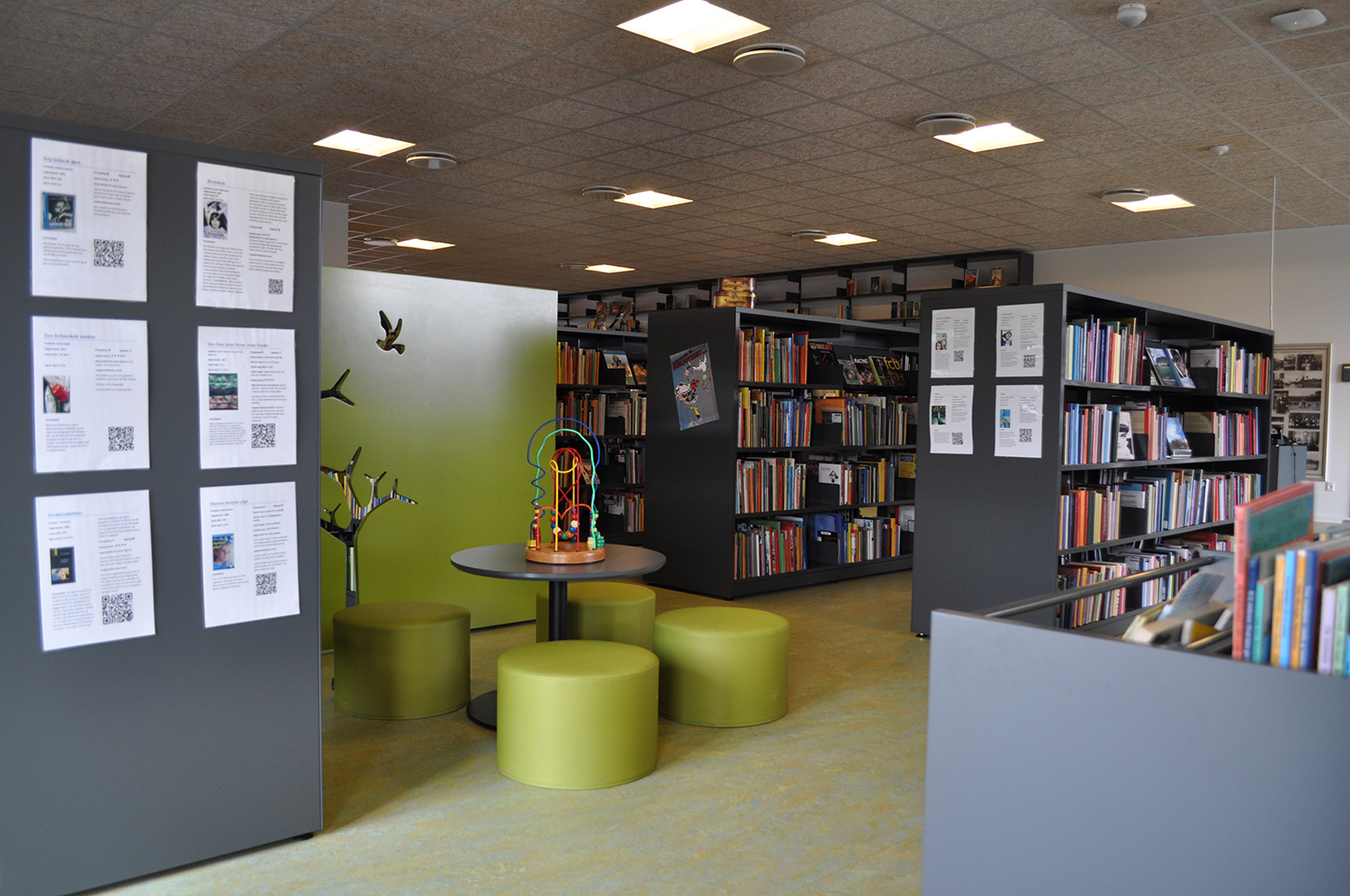 Det har en personlig stil och en hemtrevlig atmosfär med specialtillverkade hyllor, integrerade datorbord och många andra skräddarsydda lösningar. Till exempel färgrika väggar mellan hyllorna som skapar roliga avskärmade ytor för besökarna.