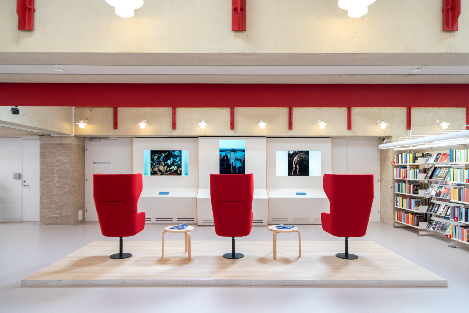 Museiväggen är specialbyggd med digitala skärmar som visar utvalda konstverk och utställningar, fritt tillgängligt för alla besökare. Inrättandet av brädspelsområdet föranleddes av en önskan om att tillföra helt nya typer av material till biblioteket med fokus på gemenskap och samvaro.