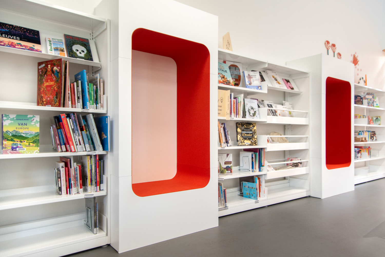 Här finns originella sittmoduler, en vertikal Cocoon och sittpuffar för avskild eller avslappnad läsning.