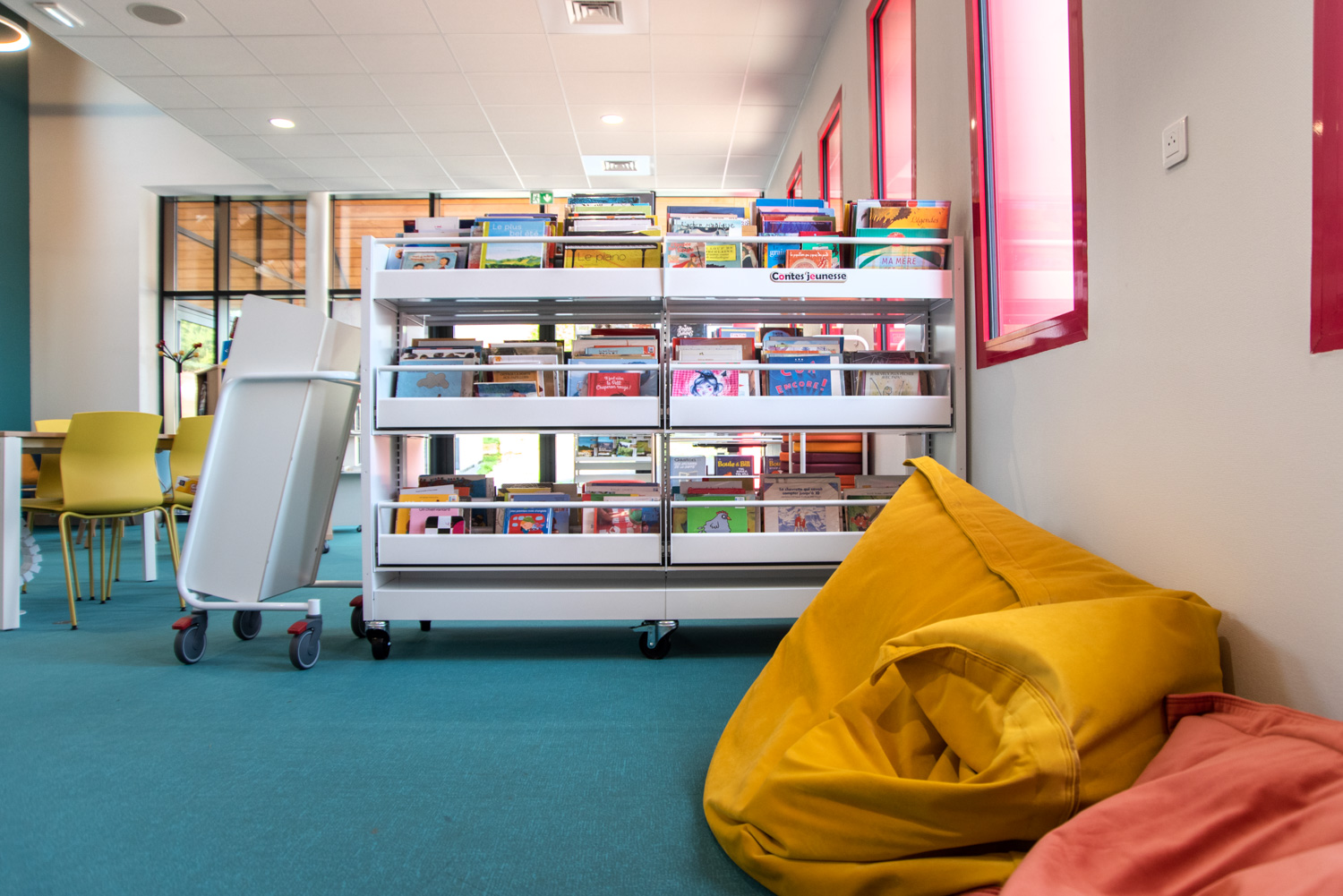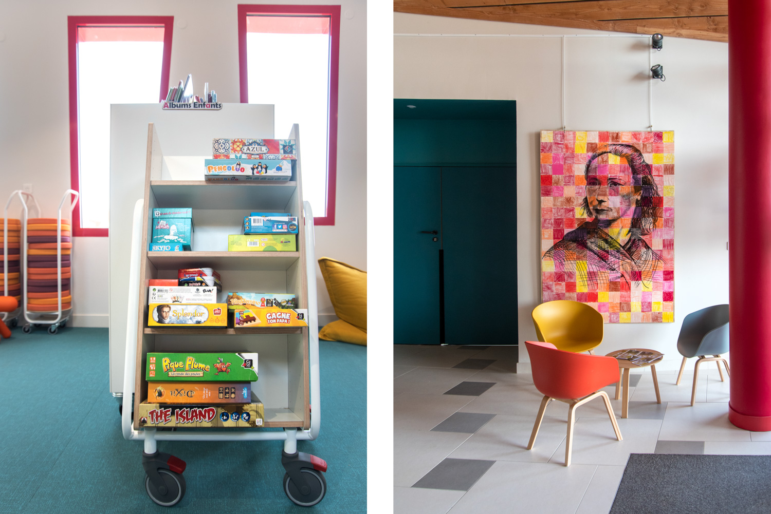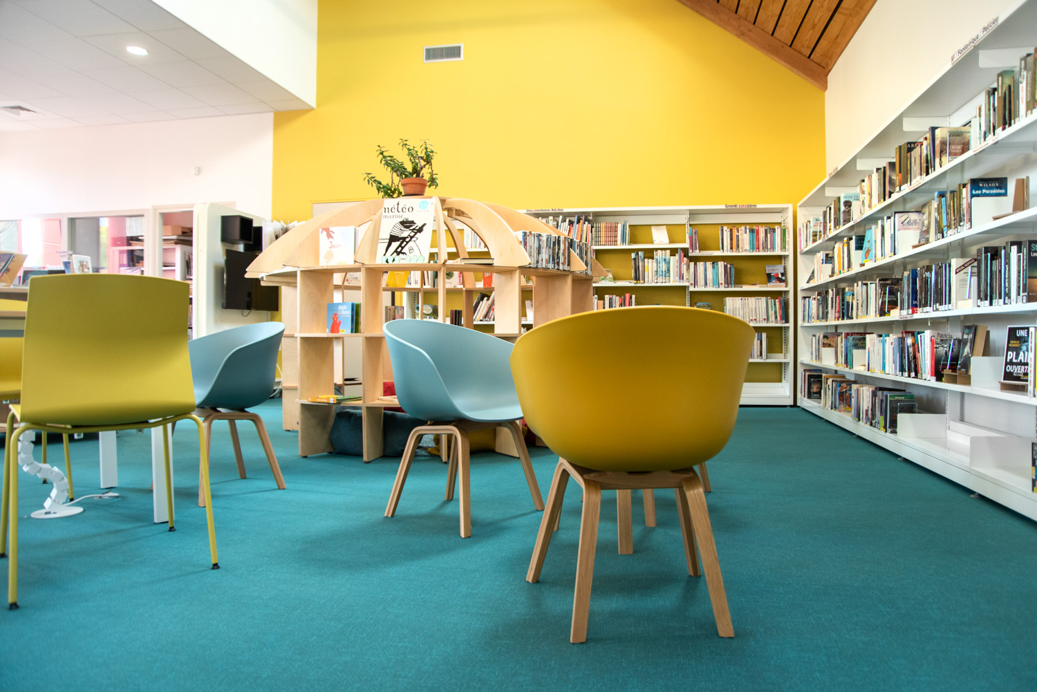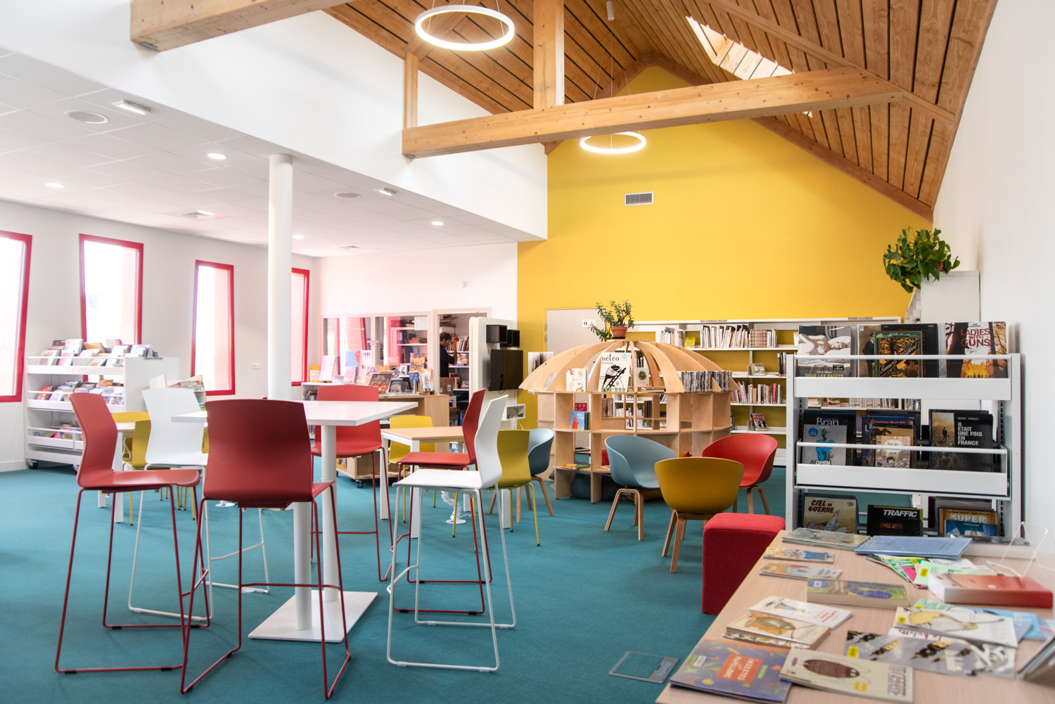 Inredningen är ett vackert resultat av gott samarbete mellan arkitekten, kommunen, biblioteket och designteamet från BC Intérieur som tillsammans kommit fram till val av möbler, färger och material. På en relativt liten yta (100 m²) har de lyckats skapa en plats som omfamnar alla. De små tar sin tillflykt till läshyddan, soffan bjuder in föräldrar till högläsning för sina barn, de höga barmöblerna är en idealisk mötesplats för lek och arbete, sittsäckar som man kan sjunka djupt ner i, mjuka fåtöljer där man kan dricka kaffe och läsa en god bok… ett behagligt ställe för alla.