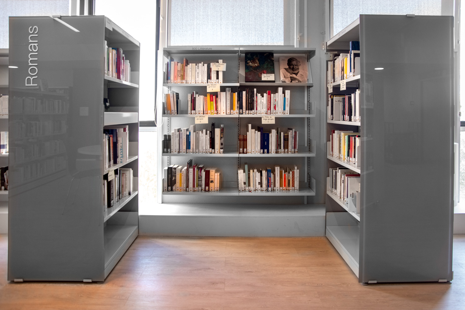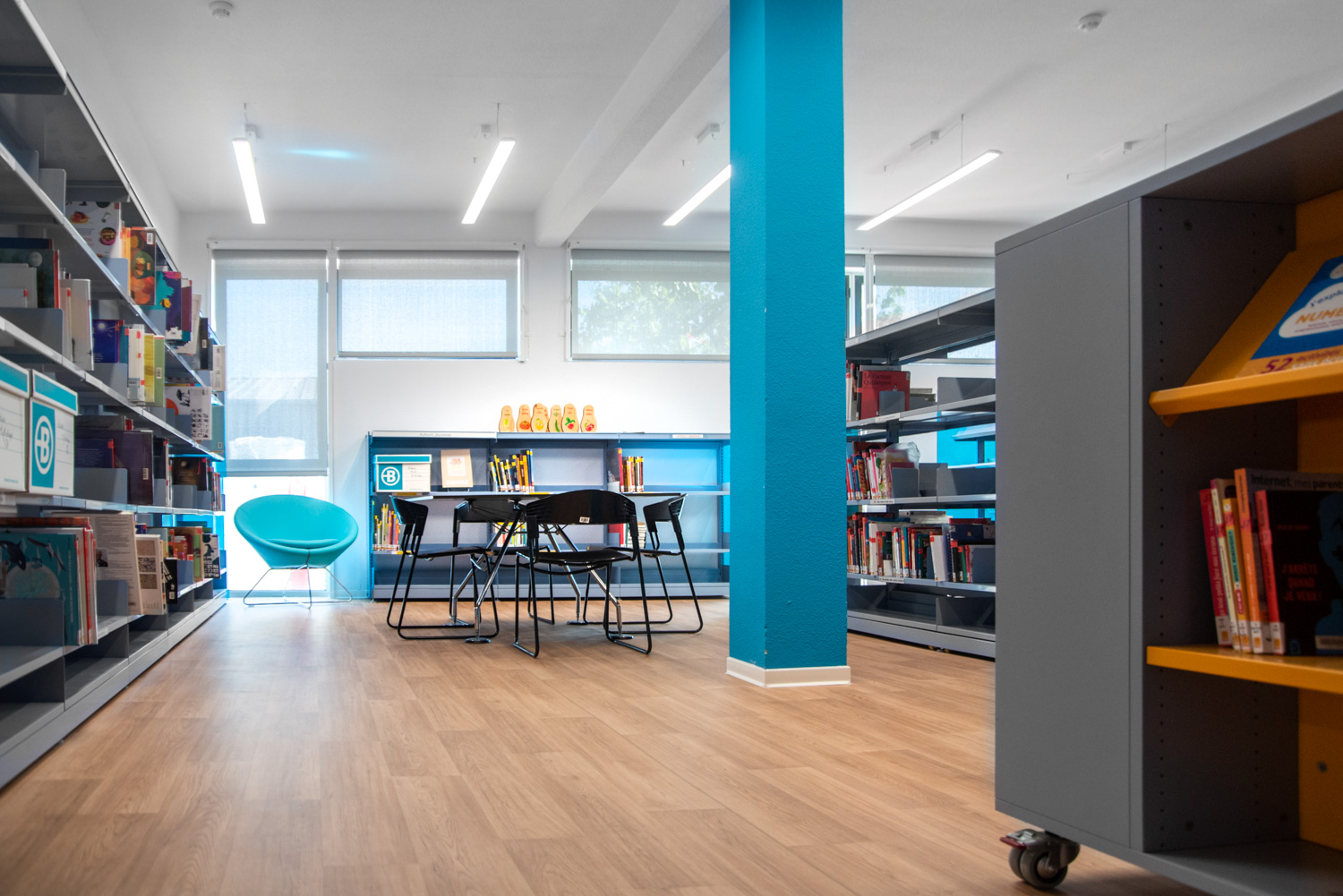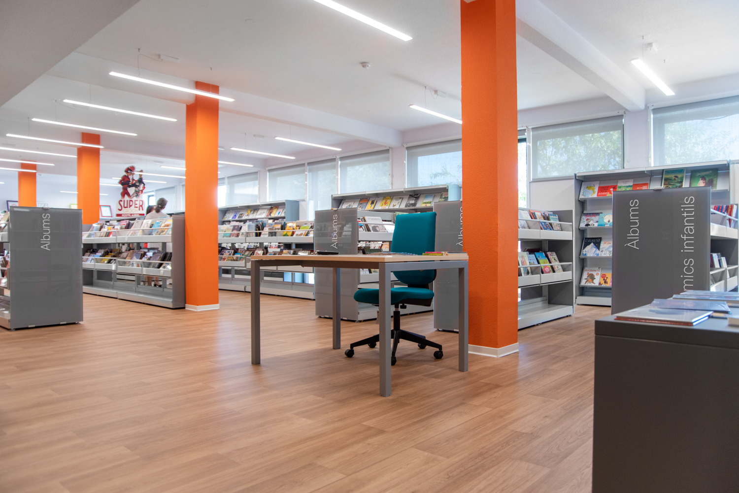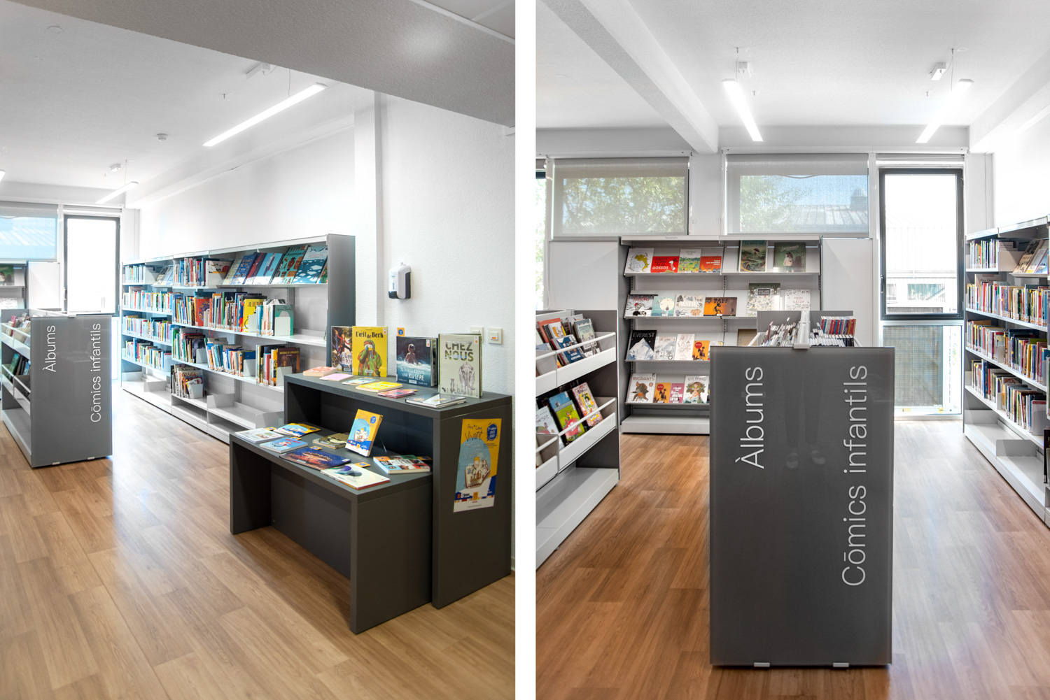 De gamla renoverade butikerna är nu uppdelade i fyra områden. På bottenvåningen finns en ungdomsavdelning samt ett underhållningsområde och en trappa upp finns vuxenavdelningen samt ett brädspelsområde. Varje område kännetecknas av en bestämd färg som används till skyltningen. På alla avdelningar är det möjligt att få service och hjälp på katalanska språket och det finns resurser till fjärrpublik (till exempel samlingar med stor skrift och ljudböcker) samt olika medietyper (CD, vinylskivor, DVD osv.).