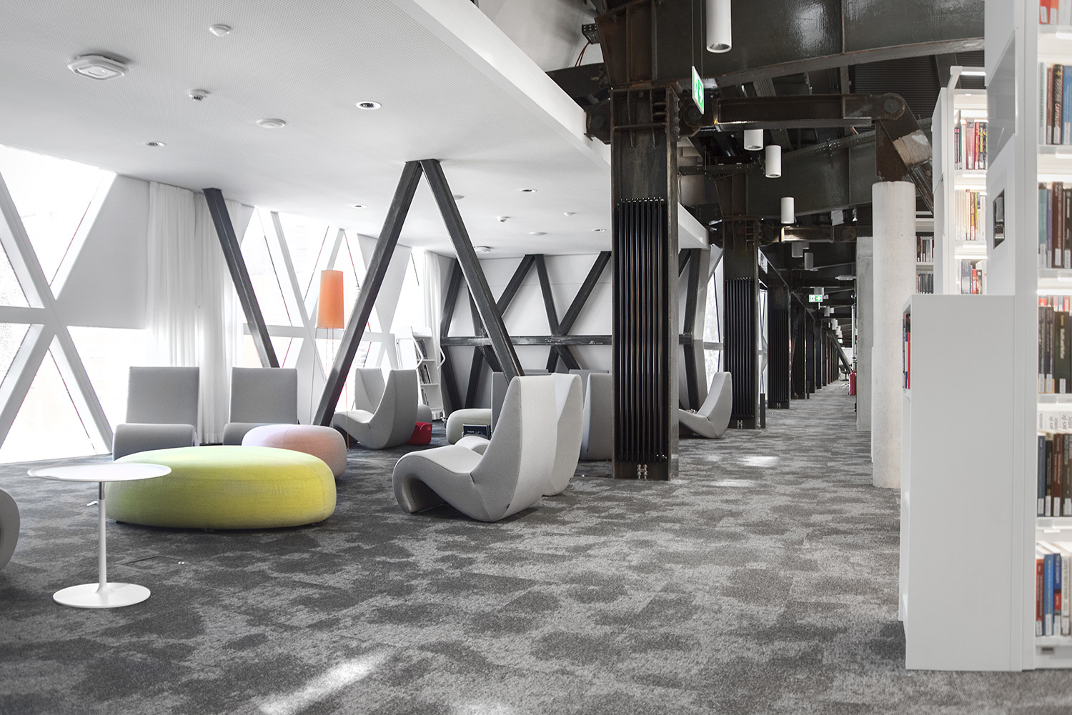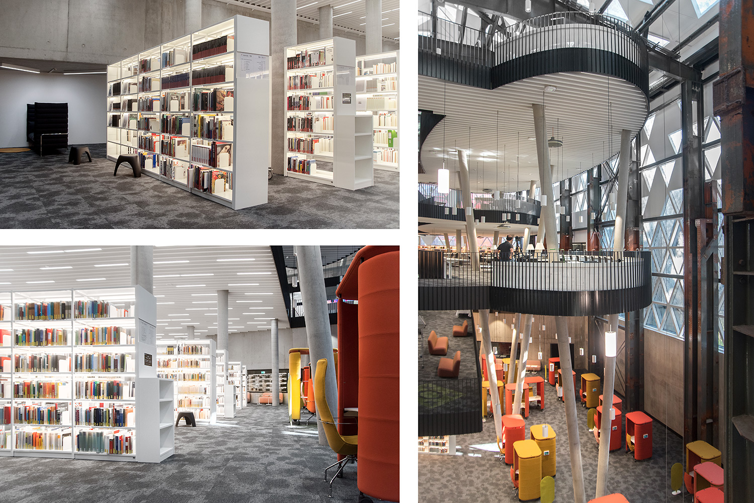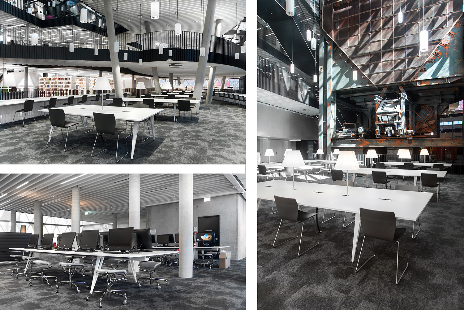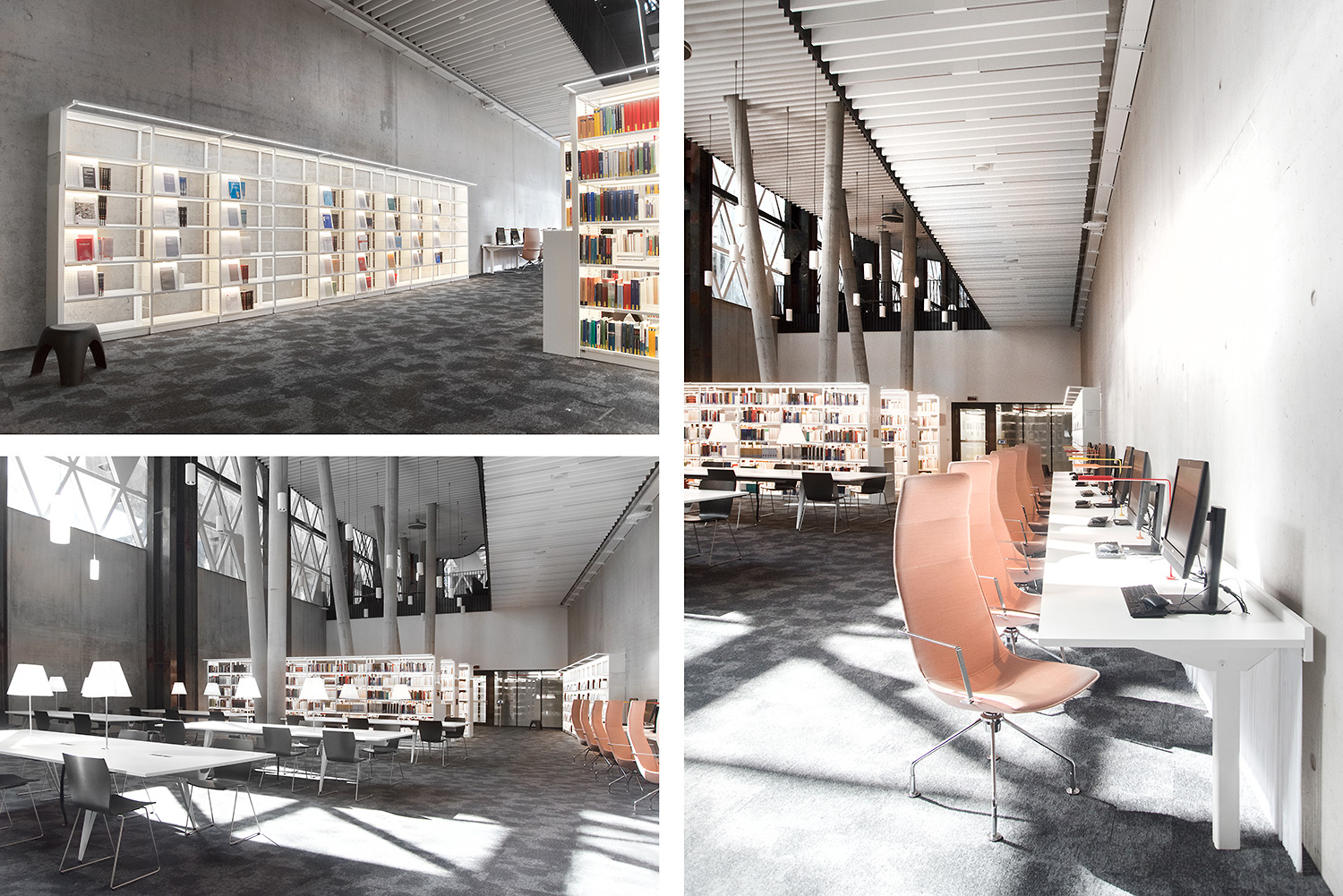 Den enastående arkitekturen skapar tillsammans med möbler av hög kvalitet en attraktiv och flexibel inramning som gör det vetenskapliga biblioteket till en lustfylld plats att träffas, arbeta och dela kunskap.