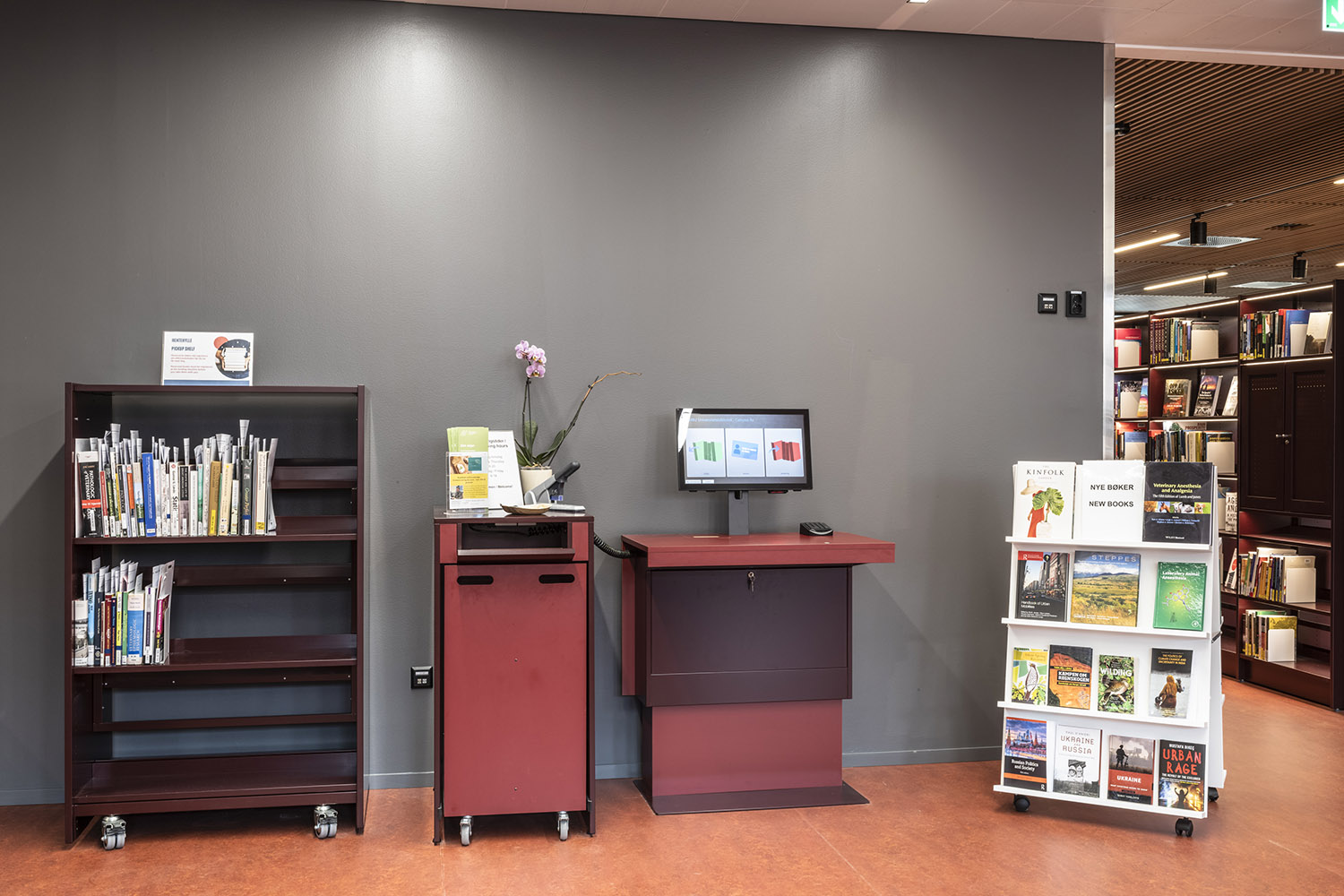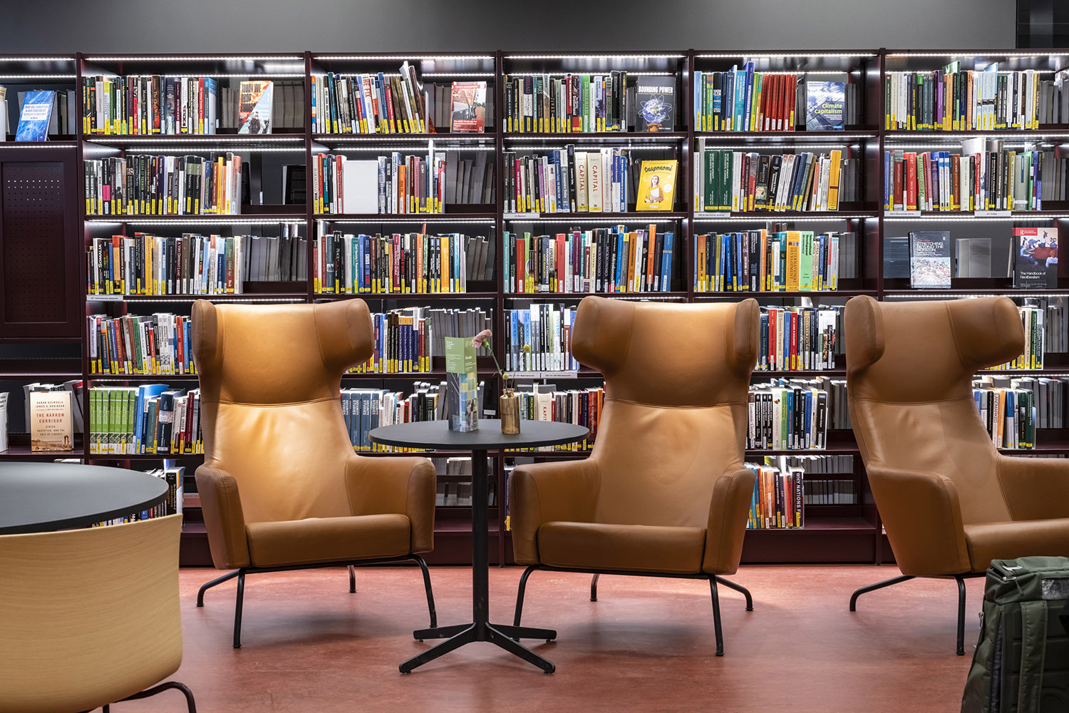 Hyllinredningen är en blandning av låga hyllor på hjul för flexibilitet och höga hyllor med fast monterade, flyttbara stegar för att komma åt de översta hyllplanen. Integrerad LED-belysning på varje hyllplan gör det lättare att läsa boktitlarna.