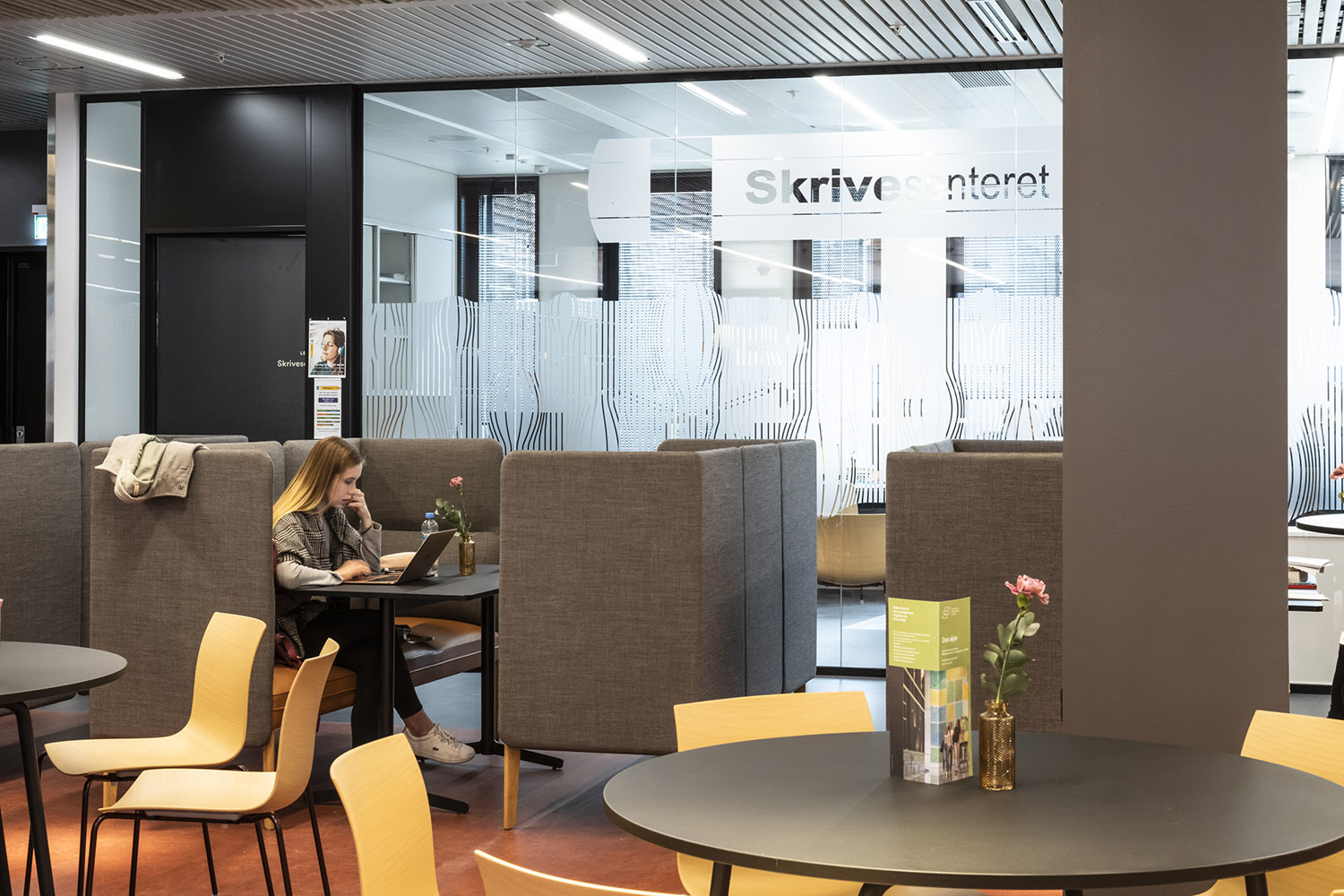 Inbjudande sittområden är viktigt, och i biblioteket finner man både individuella läsplatser och platser för grupparbete.