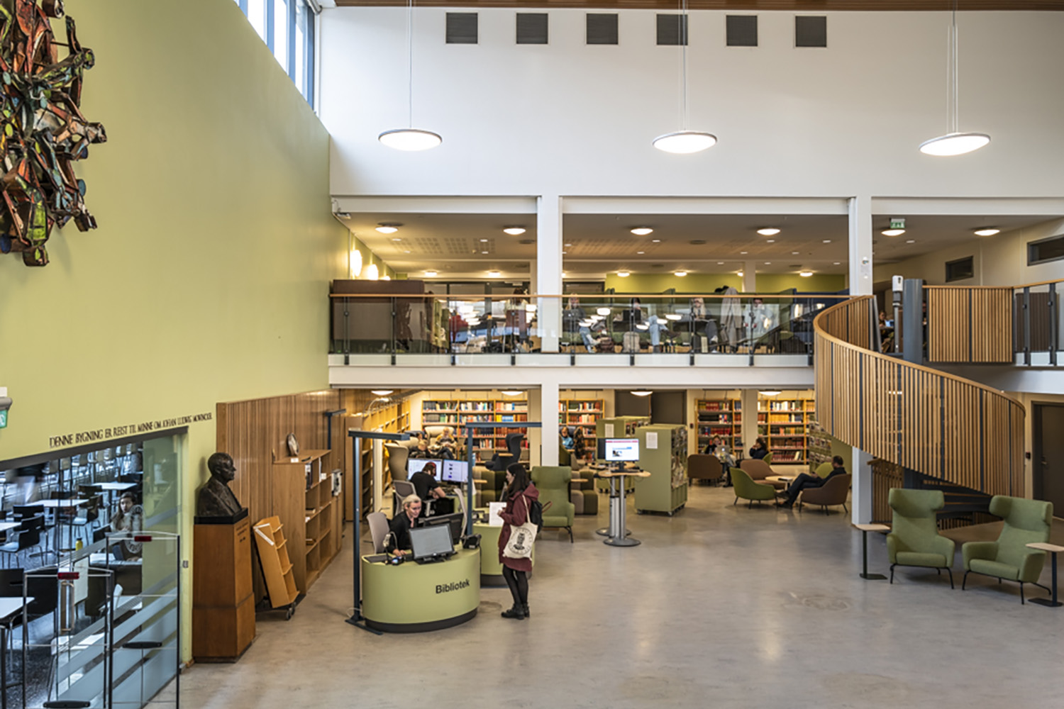 I inredningen har, förutom praktiska studieplatser, tyngdpunkten lagts på att skapa små, mysiga sittgrupper. Ett stort område möjliggör olika sorters utställningar och erbjuder enkel tillgång till informationssök.