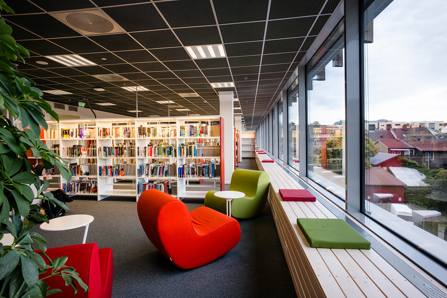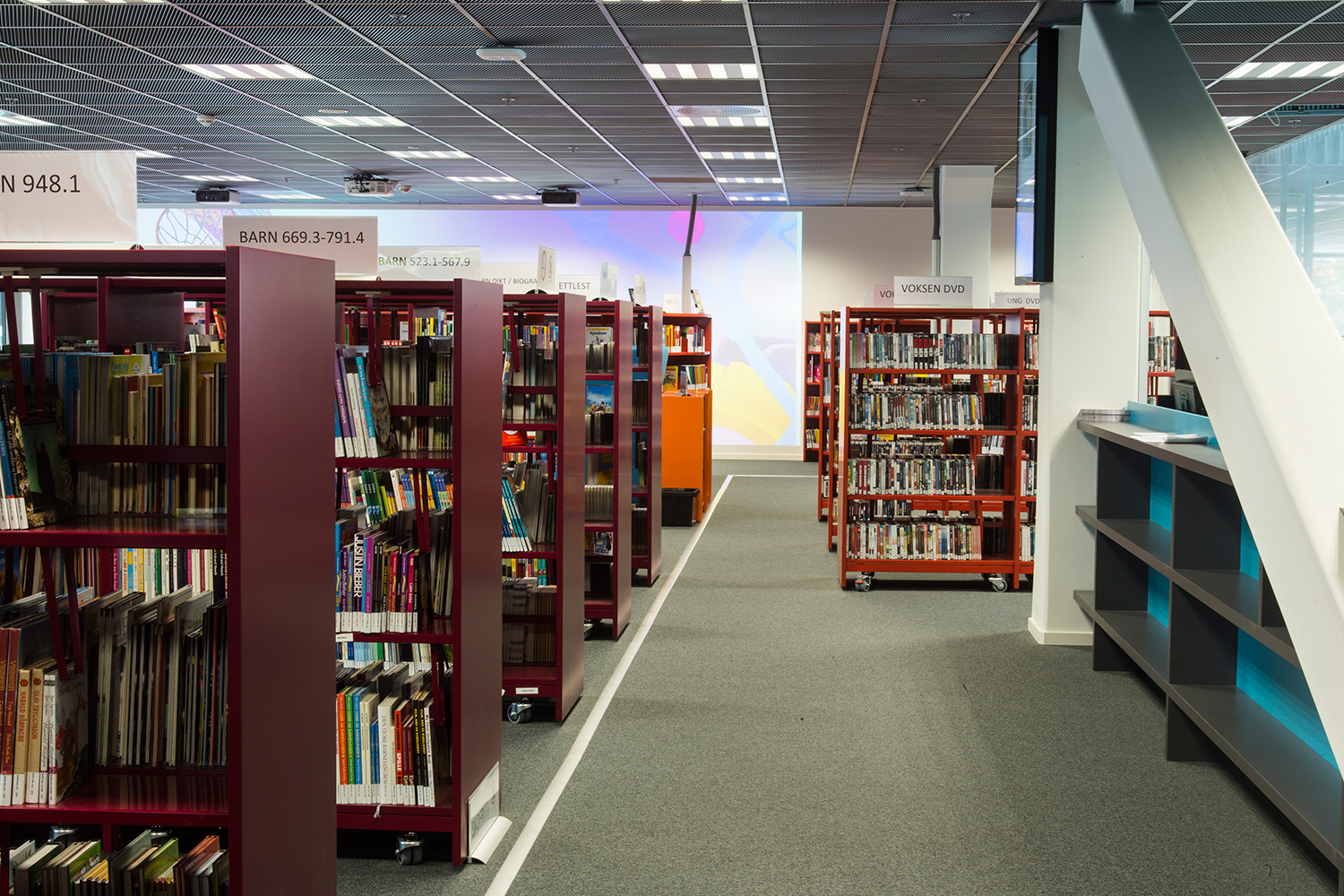 Biblioteket har utvecklats i ett samarbete mellan biblioteket, vårt systerbolag BS Eurobib och Redia A/S, som har levererat de interaktiva lösningarna. BS Eurobib har levererat alla möbler, inredning och belysning och har haft stort fokus på färger, ljus och design.