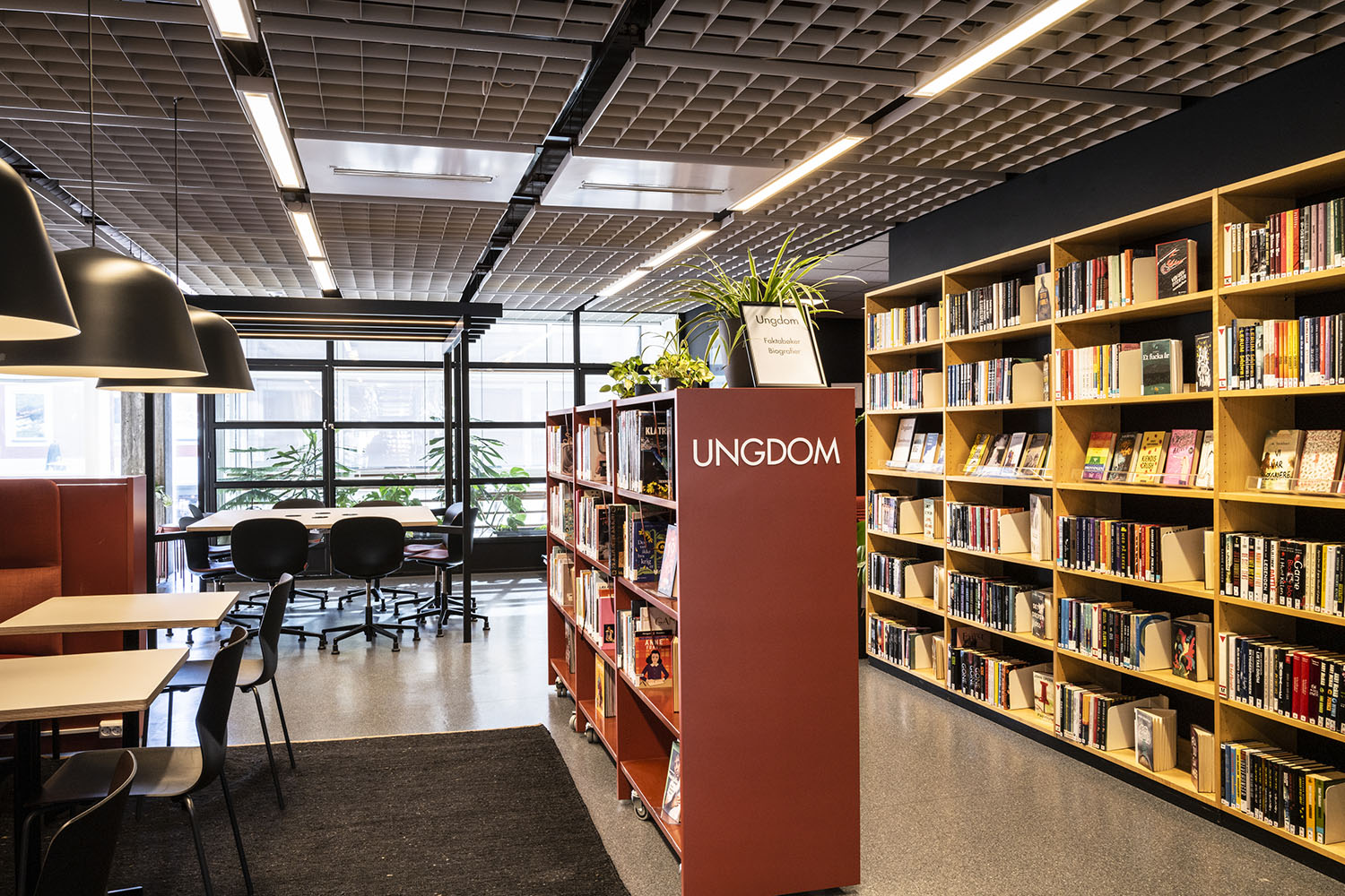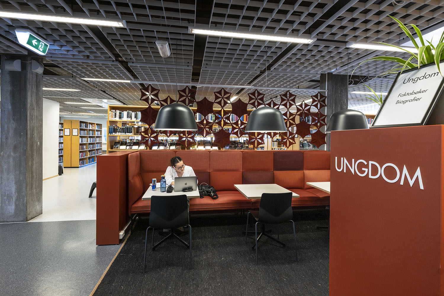 Önskemålet med ungdomsavdelningen var att skapa ett mysigt och lite avskilt område från resten av biblioteket. Här kan ungdomar träffas för att umgås, och både sittplatserna och arbetsborden för grupp- och skolarbeten är mycket populära. Samtidigt är vägen till skönlitteratur i vuxenavdelningen kort.