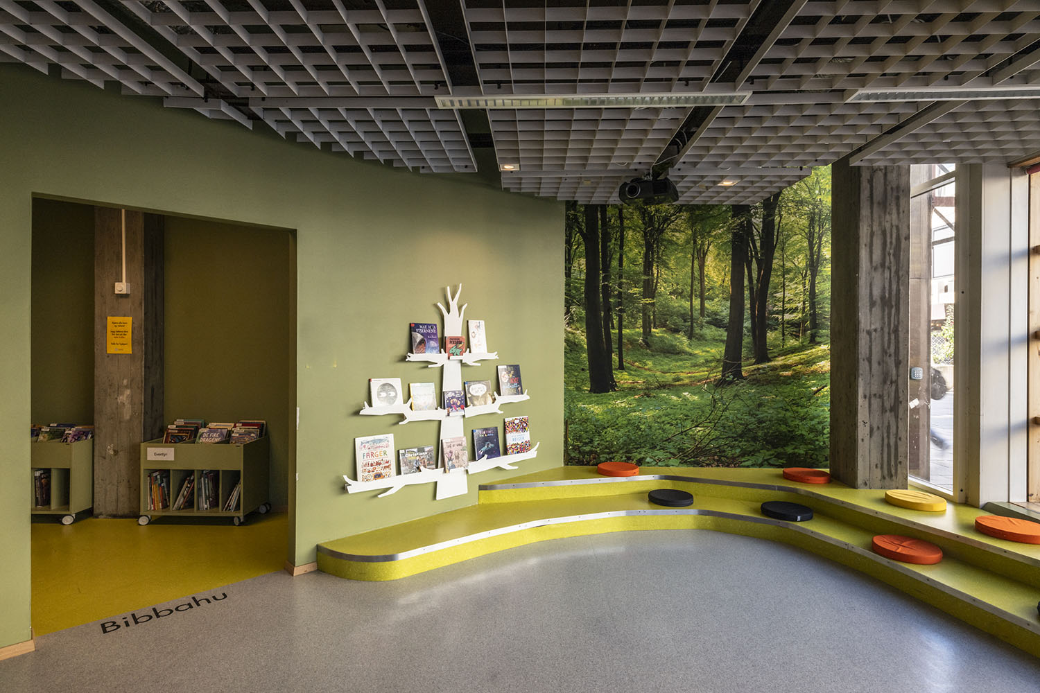 Barnavdelningen inreddes för några år sedan, och här uttrycks biofil design på många sätt. Naturen bjuds in genom användning av väggfolie, produkter och färger. I den lilla grottan kan man ordna spännande upplevelser för de minsta, och i den specialanpassade amfiteatern kan man hålla sammankomster för äldre barn och skolklasser.