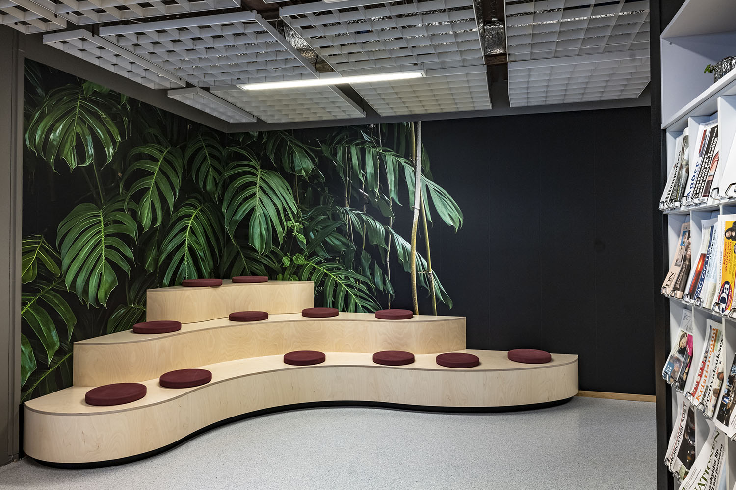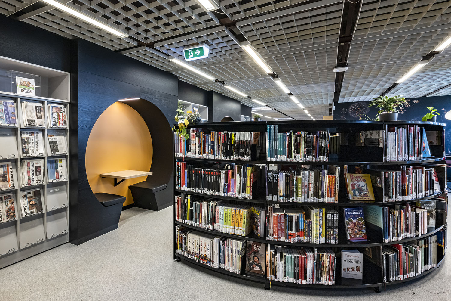 Biblioteket är inrett med både återbruk, renovering av befintliga möbler och nya hyllor. De nya färgglada hyllorna skapar en liten oas som står i fin kontrast till de befintliga naturfärgade hyllorna. Den befintliga Senso-soffan, som tidigare hade en annan form någon annanstans i biblioteket, har omformats till en iögonfallande sittgrupp med nya ryggelement i flera, harmoniska färger.