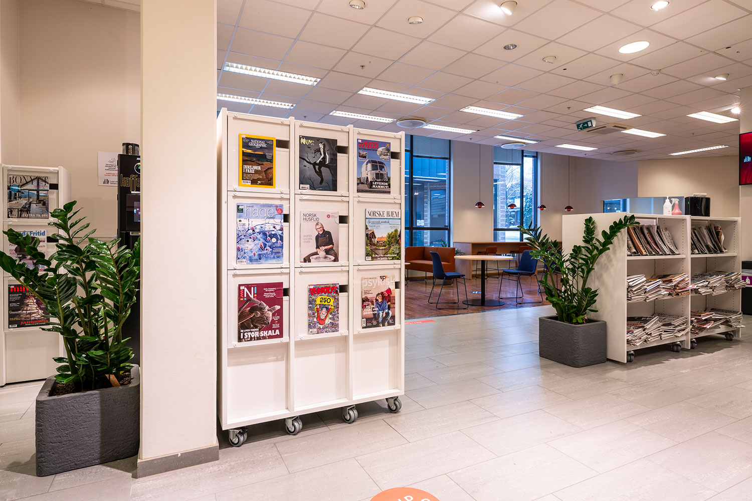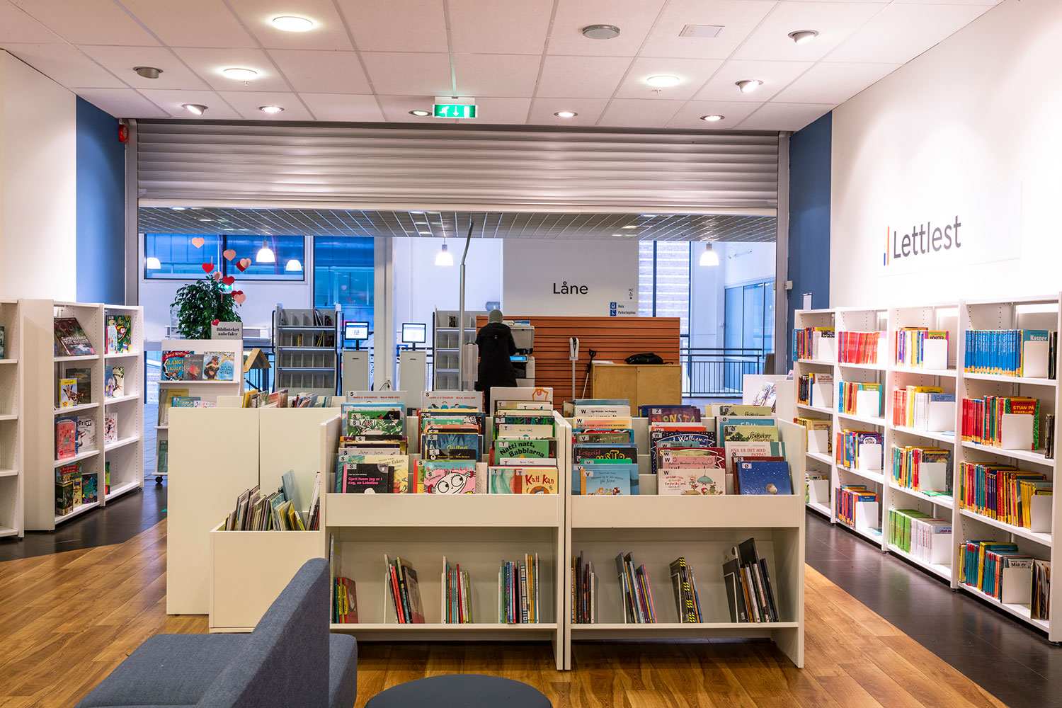 Man har lyckats kombinera en kompakt yta i delar av biblioteket med mer öppna lokaler i andra delar, där man även kan hålla större arrangemang. Man har gjort plats för ett särskilt rum för skolklasser och andra organiserade aktiviteter under dagtid för barn och unga. Där finns en särskild avdelning för studerande med både en liten läsesal och två grupprum.