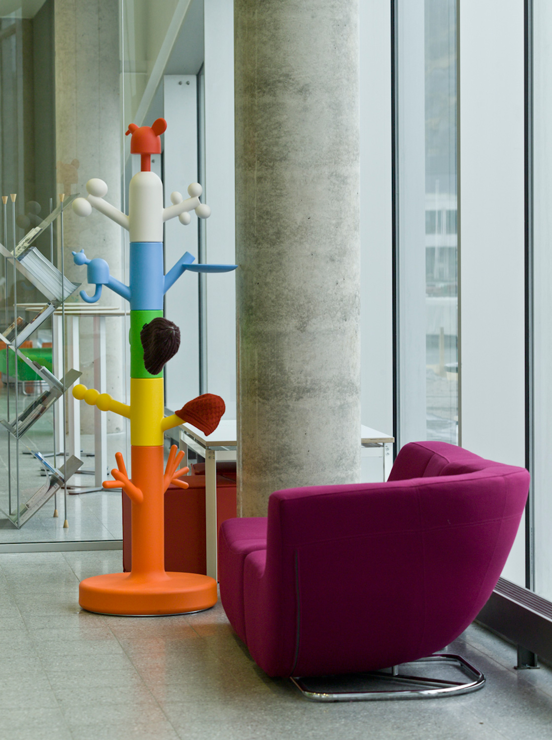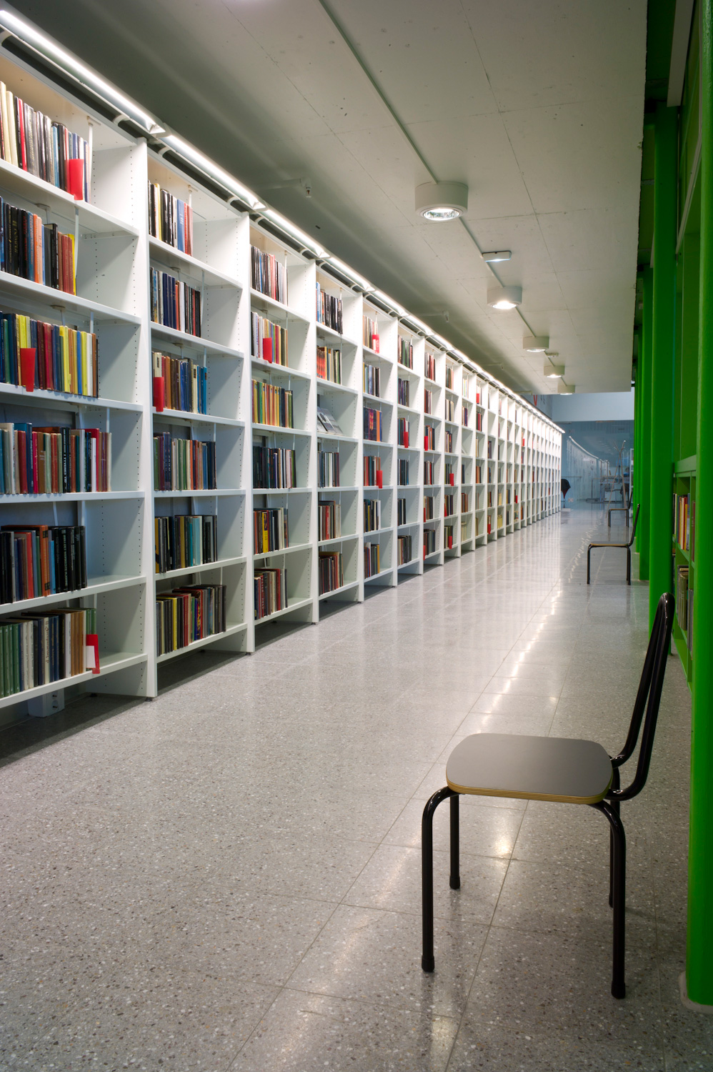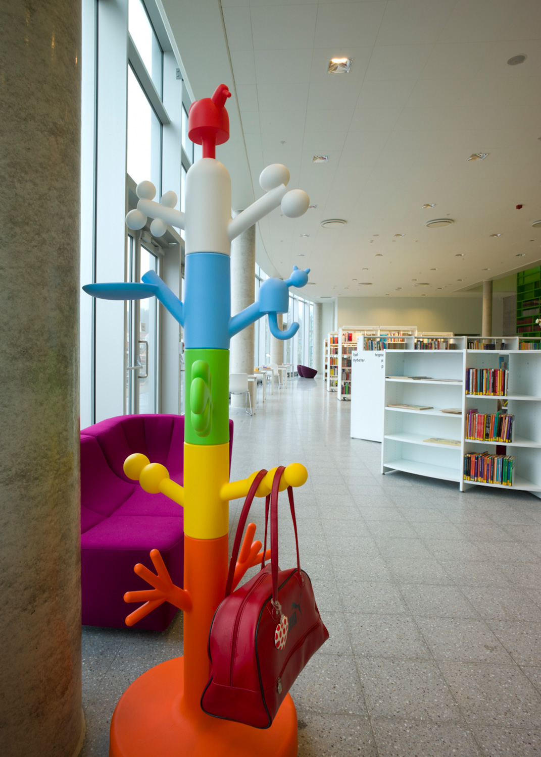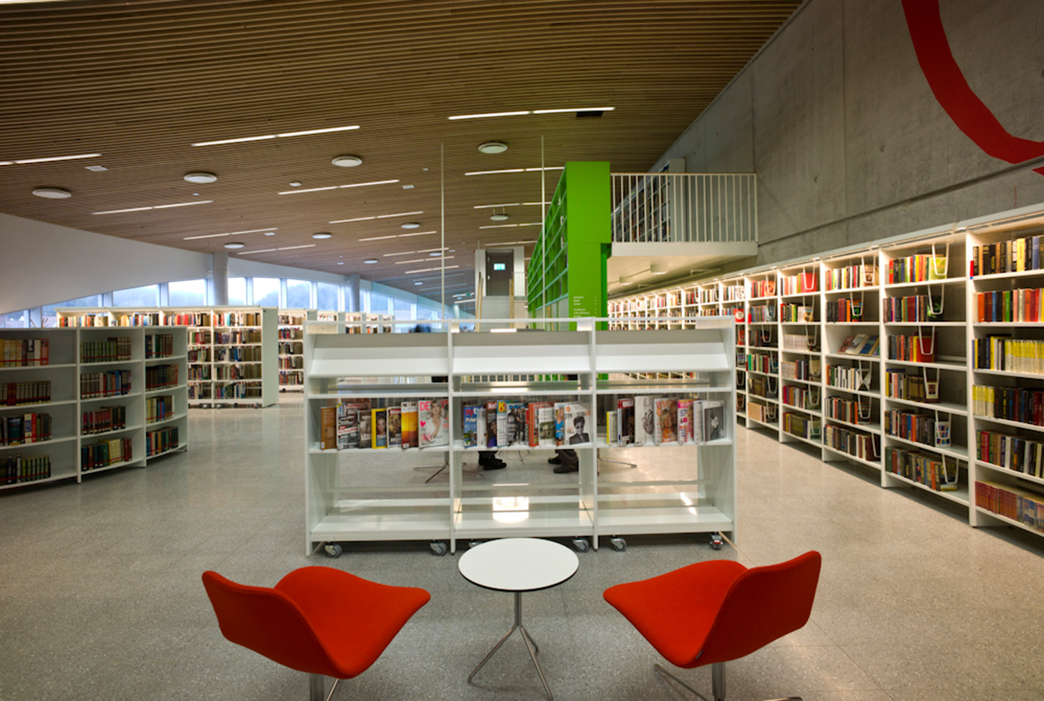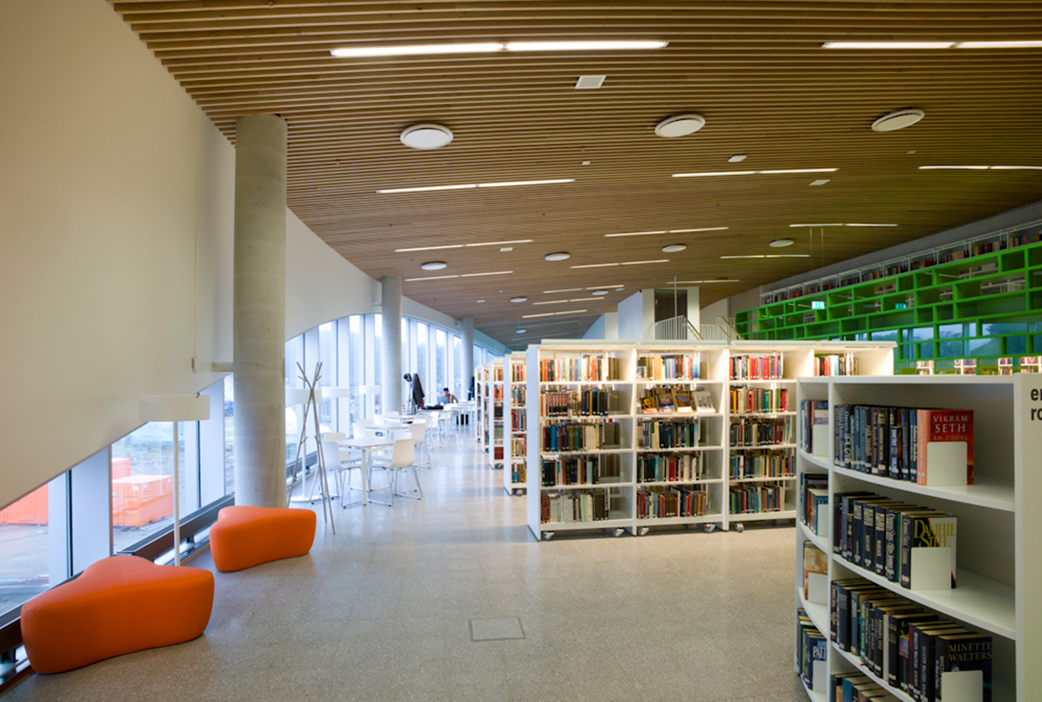 Det ljusa och luftiga biblioteket sträcker sig över tre våningar. En specialritad grön vägg från golv till tak utgör en stark kontrast mot de vita hyllorna som karaktäriserar inredningen. Panoramafönster ger en spektakulär utsikt över floden. Natur och traditioner möter utveckling och innovation.