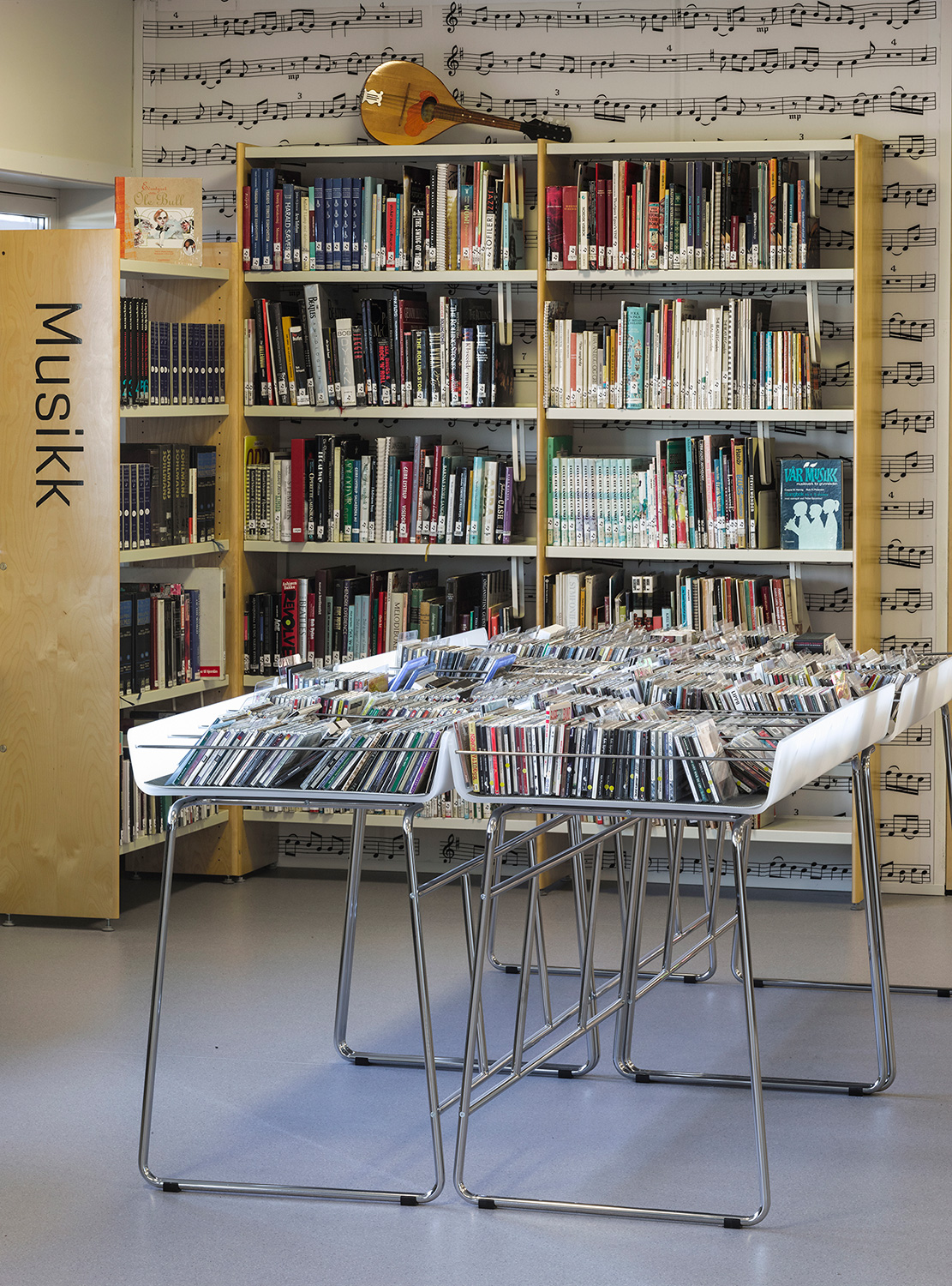 Befintliga hyllor av typen Softline har fått en ansiktslyftning med nylackerade exponeringsgavlar och skyltar. Den höj- och sänkbara disken samt hyllor till tidskriftsavdelningen är också nyinköpta.